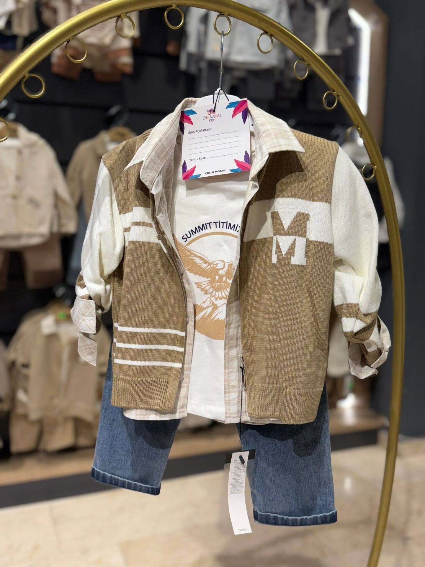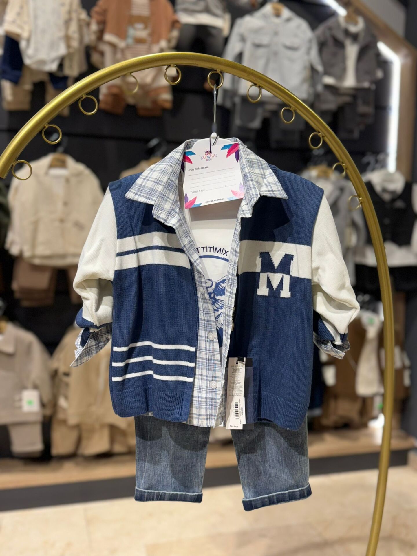 Triko ceket, gömlek, badi ve kot pantolondan oluşan bu ceketli çocuk takımı; uyumlu parçalarıyla düzenli ve şık bir görünüm sunar. Hafif ve yumuşak dokulu ceket gün boyu rahat kullanım sağlarken, gömlek ve badi birlikte kullanılarak hem konfor hem de pratiklik sağlar. Kot pantolon ise rahat kalıbı sayesinde hareket özgürlüğünü destekler. Günlük kombinlerde ve özel anlarda rahatlıkla tercih edilebilecek, kullanışlı ve özenli bir takım seçeneğidir.