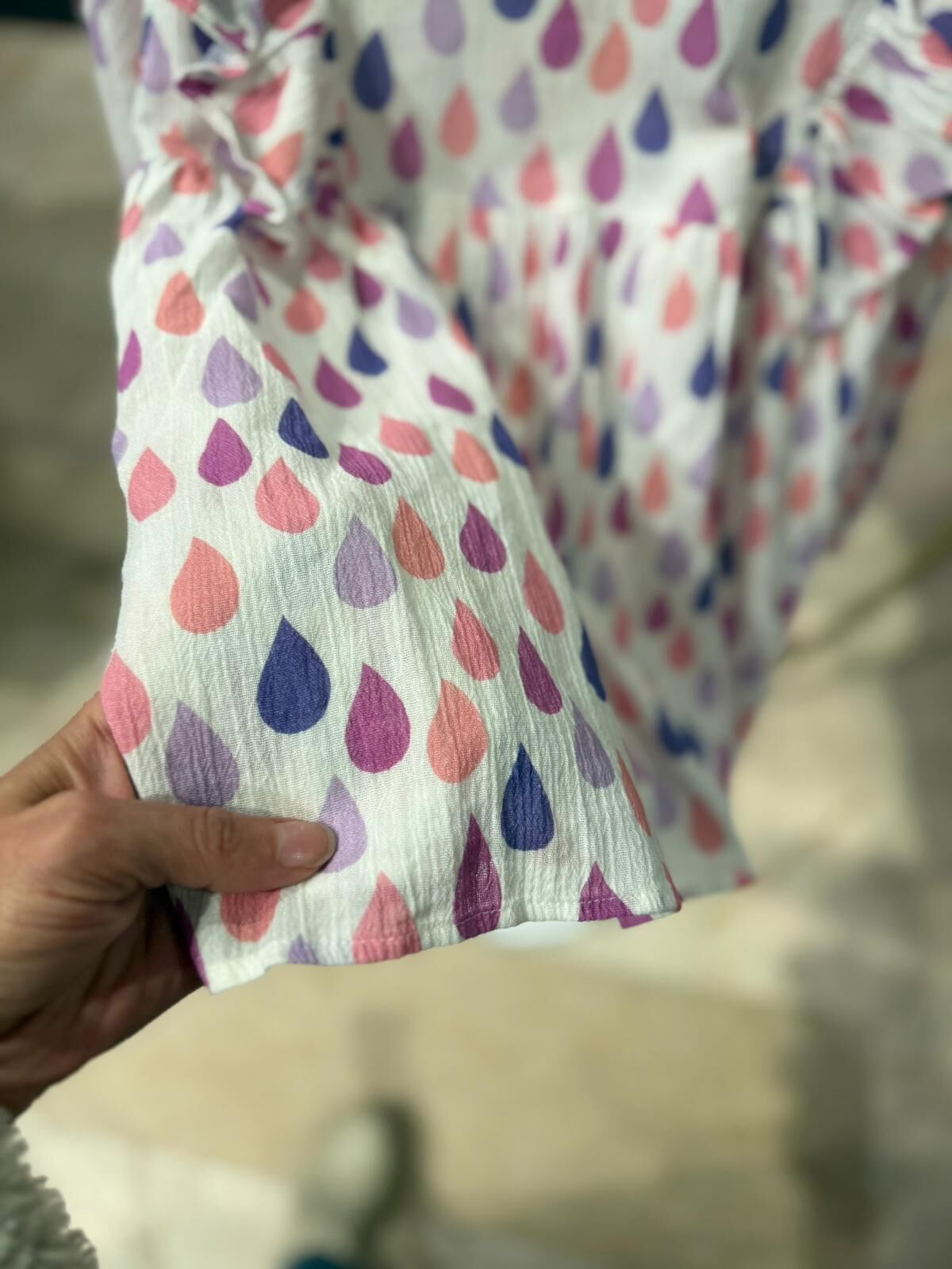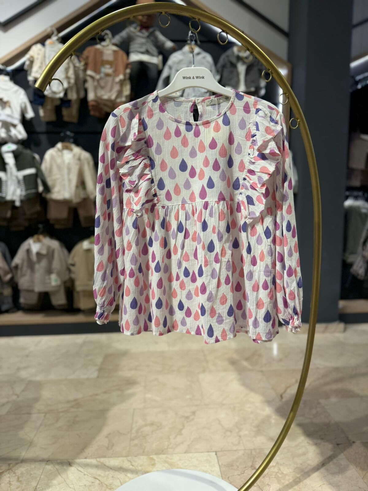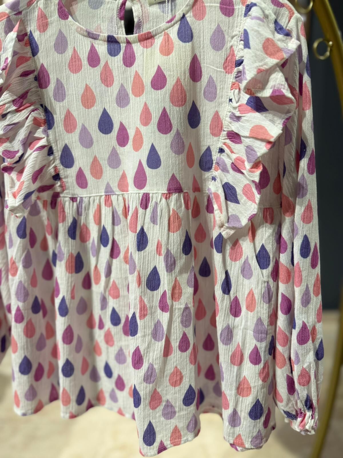 Yumuşak dokulu kumaşı ve hafif yapısıyla gün boyu konfor sunan bu bluz, hareketli damla desenleri ve omuzlardaki fırfır detaylarıyla şık bir görünüm kazandırır. Rahat kesimi sayesinde günlük kullanıma uygundur, esnek yapısı ile kolay giyilip çıkarılabilir. Hem günlük kombinlerde hem de özel günlerde tercih edilebilecek zarif ve kullanışlı bir modeldir.