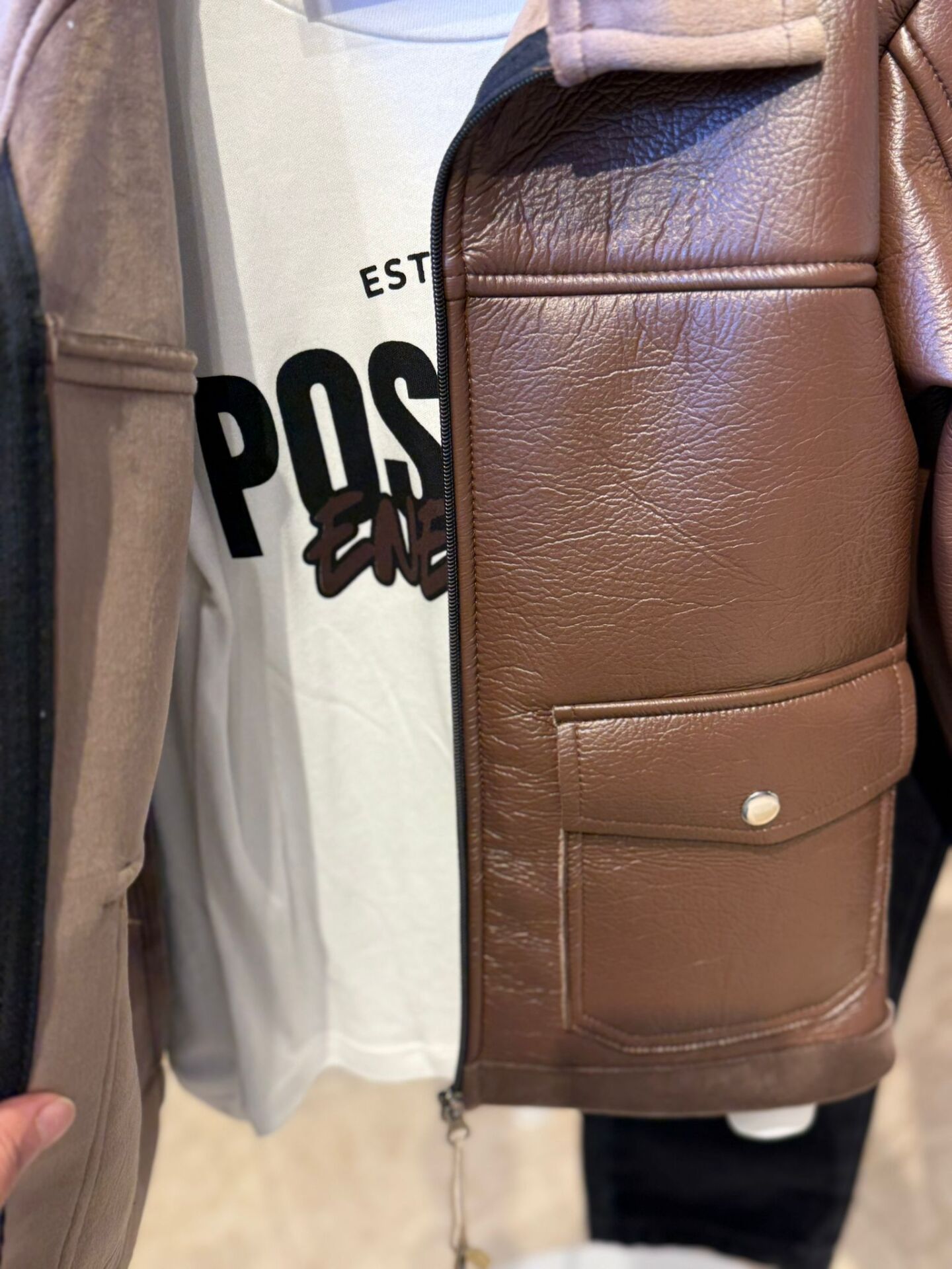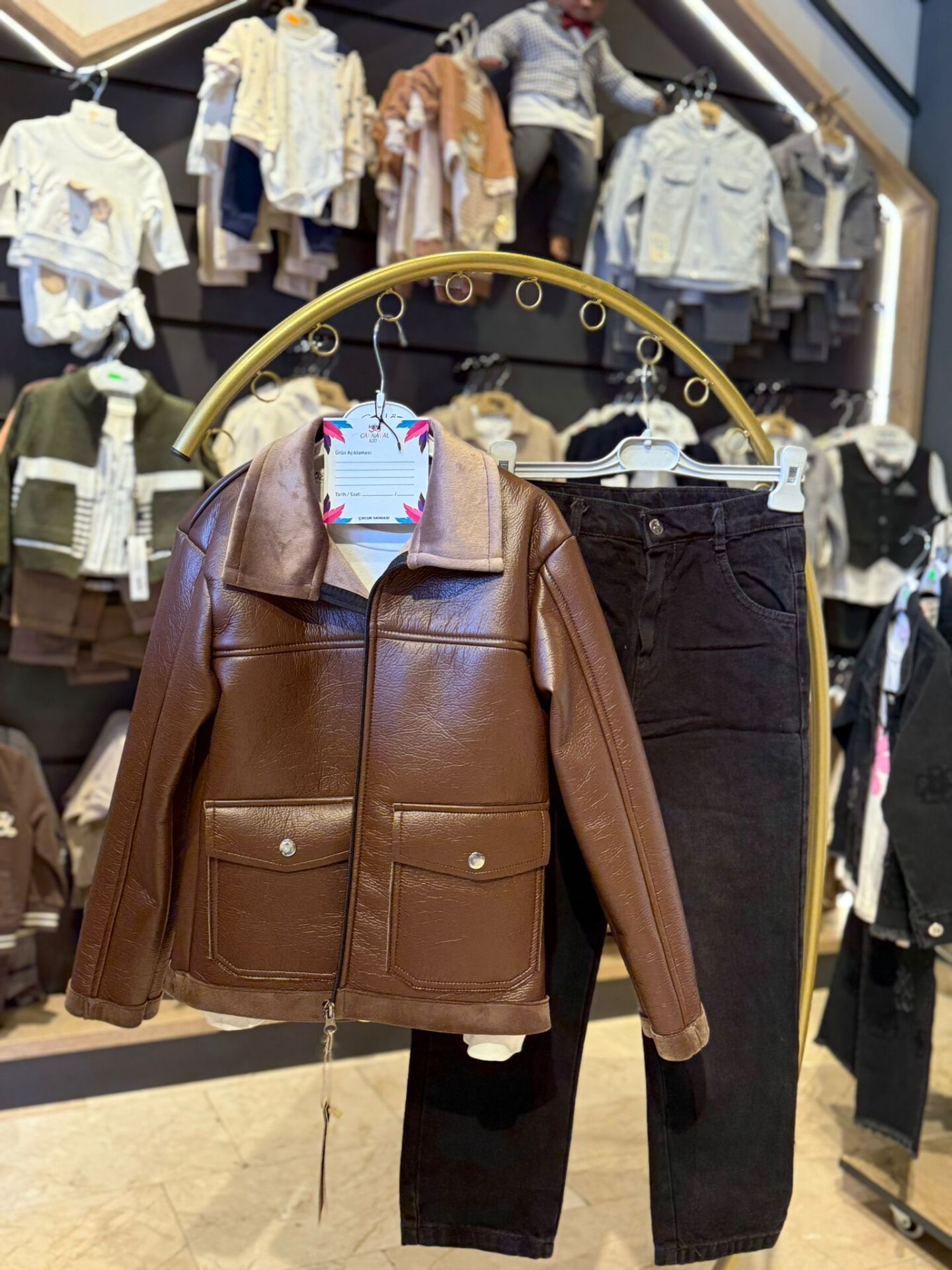 Şık ve modern tasarımıyla öne çıkan bu çocuk takımı; deri görünümlü ceket, iç badili ve siyah pantolondan oluşur. Kahverengi ceket, yumuşak dokulu deri görünümlü kumaşı ve iç kısmındaki astarlı yapısıyla hem konforlu hem de stil sahibi bir kullanım sunarken, ön fermuar kapama ve kapaklı cep detaylarıyla klasik bir görünüm kazandırır. Takımın içinde yer alan badi, yumuşak ve nefes alabilen yapısıyla gün boyu rahatlık sağlar ve ceketin altında şık bir tamamlayıcı olarak kullanılır. Siyah pantolon ise dayanıklı kumaşı ve rahat kesimi sayesinde hareket özgürlüğü sunar. Günlük kullanım, özel günler ve mevsim geçişleri için ideal olan bu takım, hem şıklık hem de rahatlık arayanlar için mükemmel bir tercihtir.