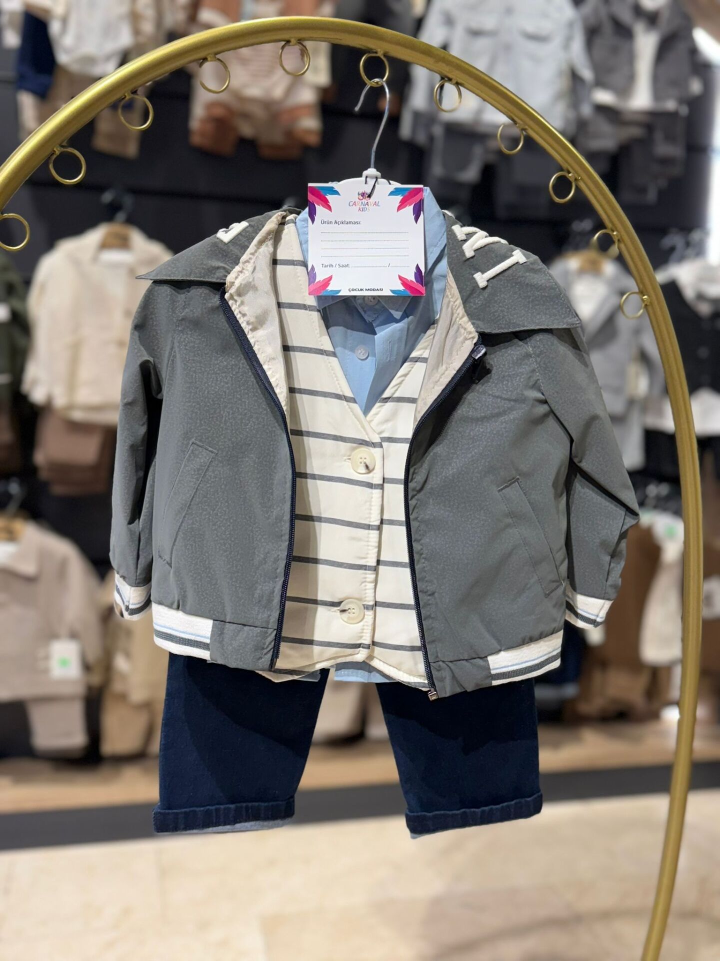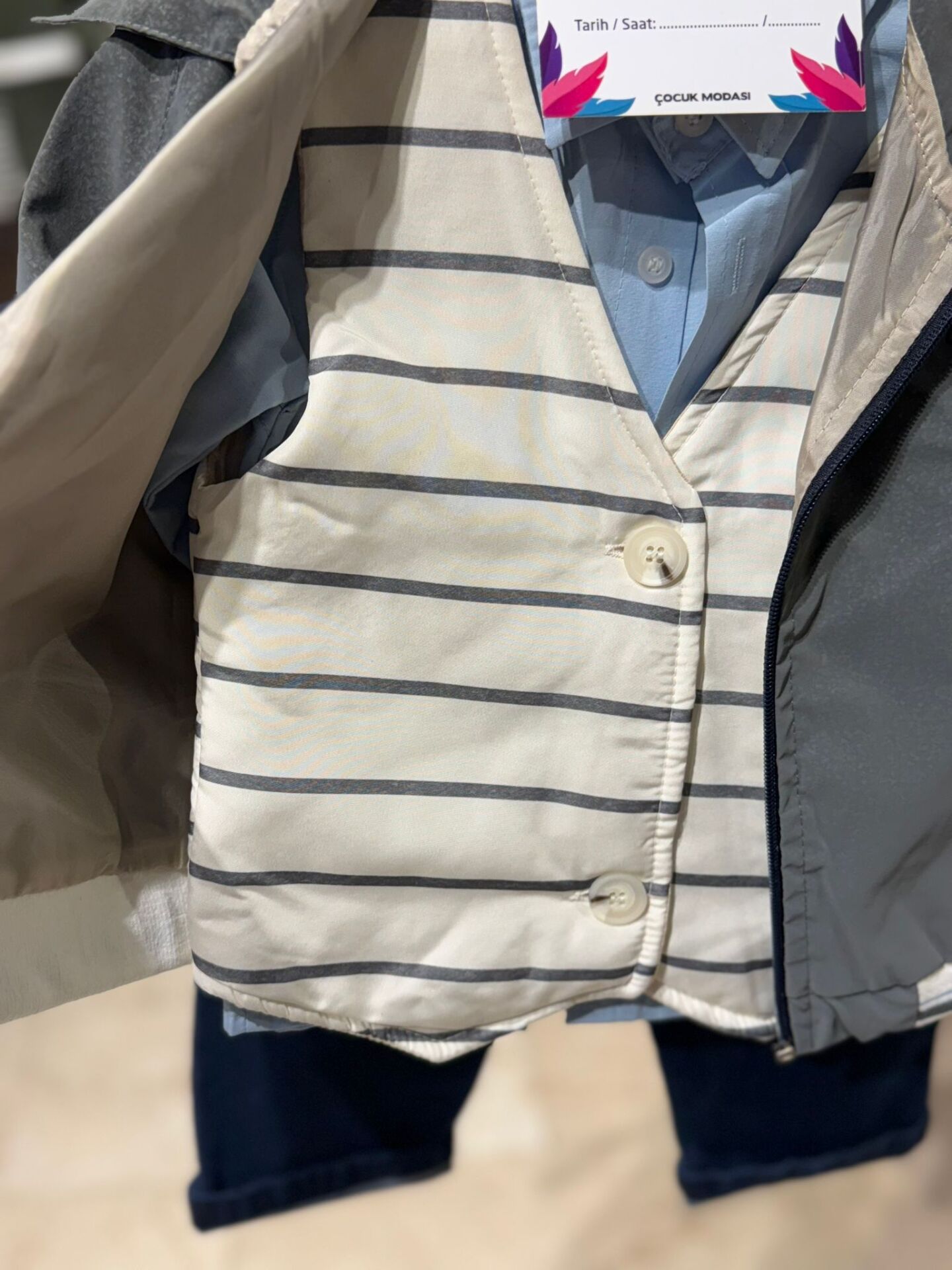 Erkek çocuklar için tasarlanan bu şık takım; fermuarlı ceket, çizgili düğmeli yelek, klasik gömlek ve uyumlu pantolondan oluşmaktadır. Katmanlı yapısı sayesinde hem günlük kullanımda hem de özel günlerde rahatlıkla tercih edilebilir. Modern renk uyumu ve rahat kalıbı ile çocuklara konfor sağlarken, kombin derdi olmadan şık bir görünüm sunar. Kaliteli kumaş yapısı sayesinde gün boyu rahat kullanım imkânı sunar.