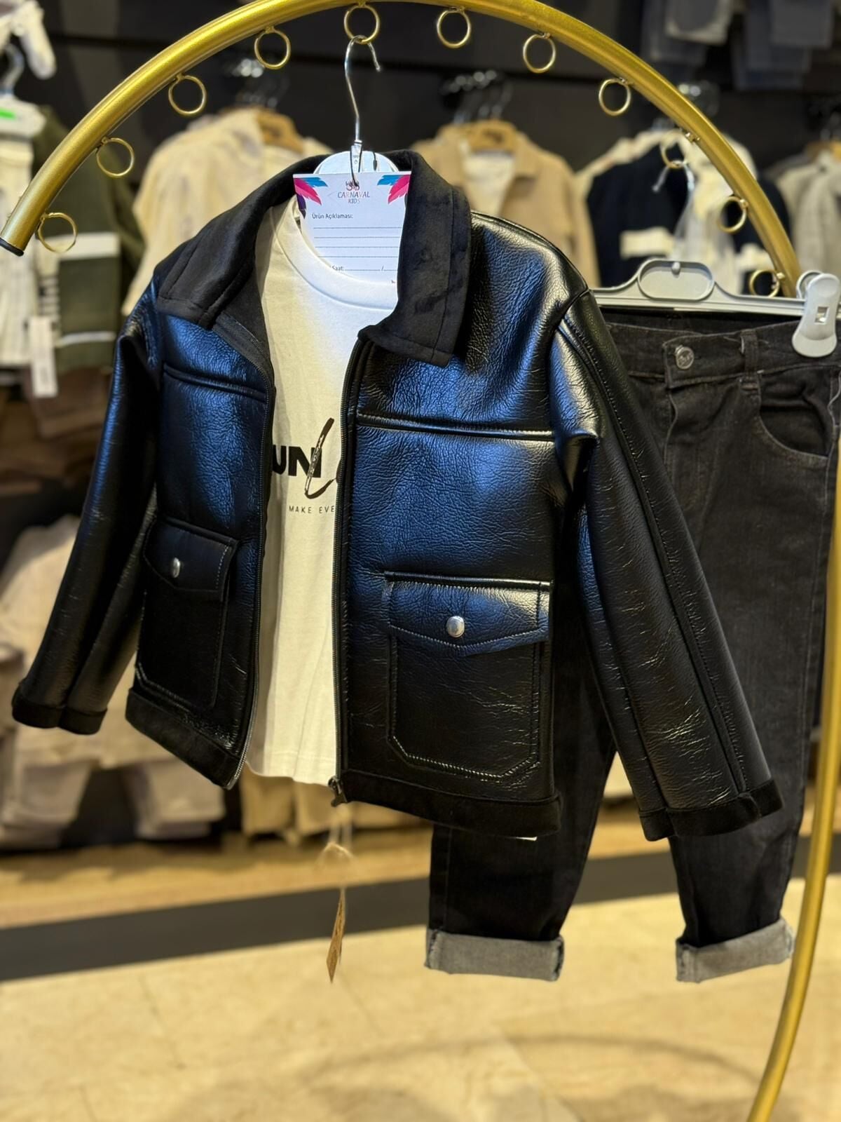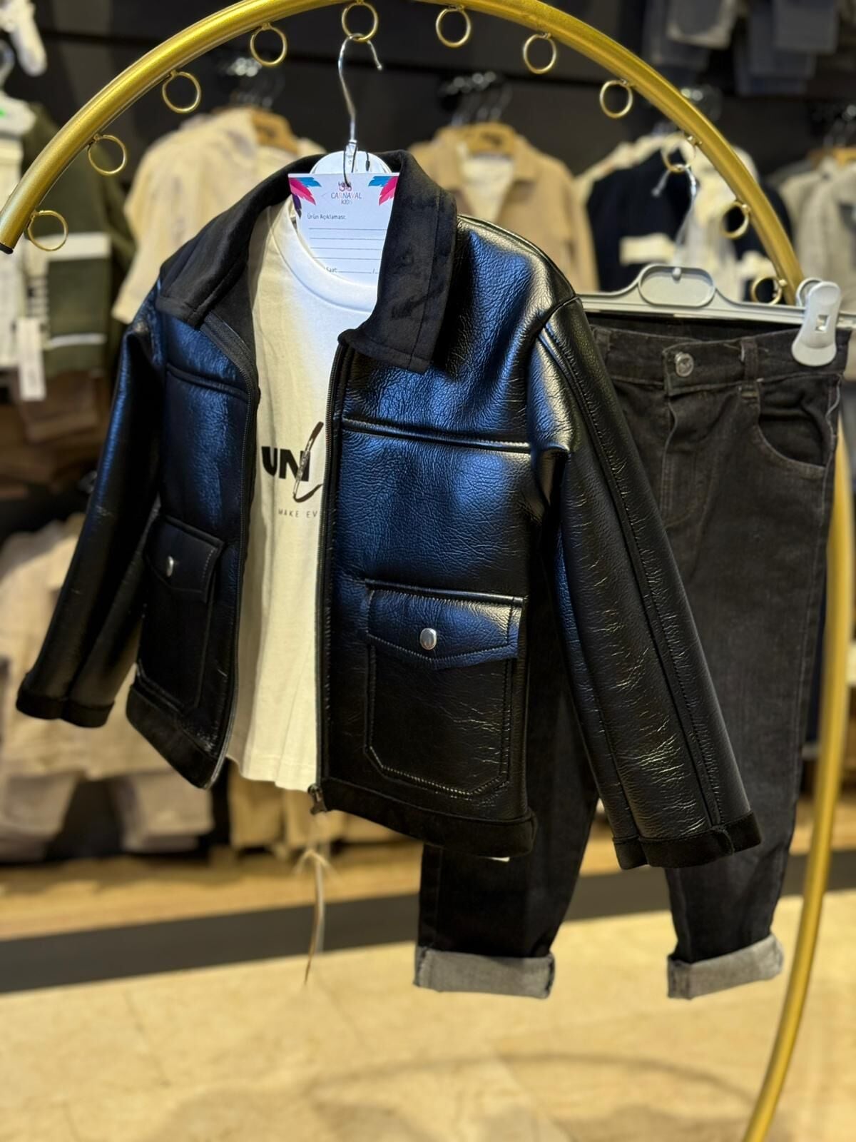 Şıklık ve konforu bir arada sunan bu erkek çocuk 3’lü takım, modern ve güçlü tarzı seven minikler için özel olarak tasarlanmıştır. Deri görünümlü ceket, basic tişört ve kot pantolondan oluşan set; günlük kullanımdan özel kombinlere kadar geniş bir kullanım alanı sunar.