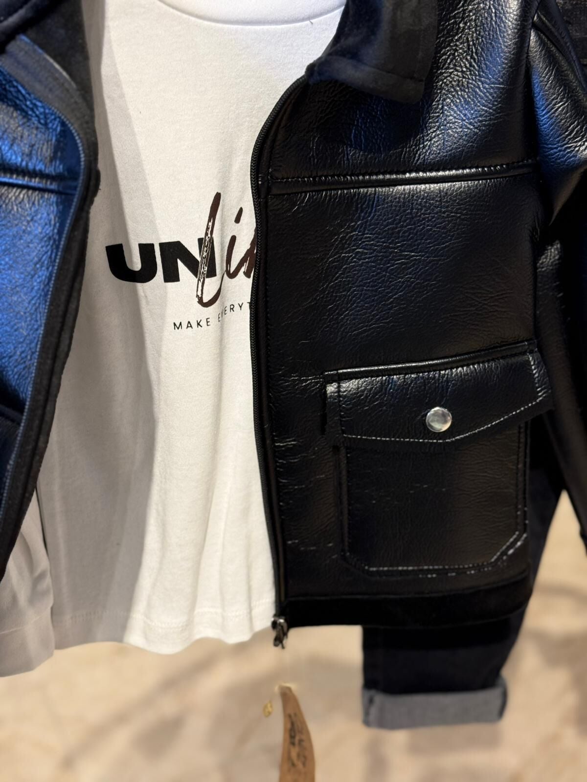 Deri görünümlü ceket, yumuşak dokusu ve modern kesimiyle dikkat çekerken; pamuklu tişört gün boyu rahatlık sağlar. Kot pantolon ise esnek yapısı sayesinde hareket özgürlüğü sunar. Parçalar birlikte kullanıldığı gibi ayrı ayrı da kombinlenebilir.