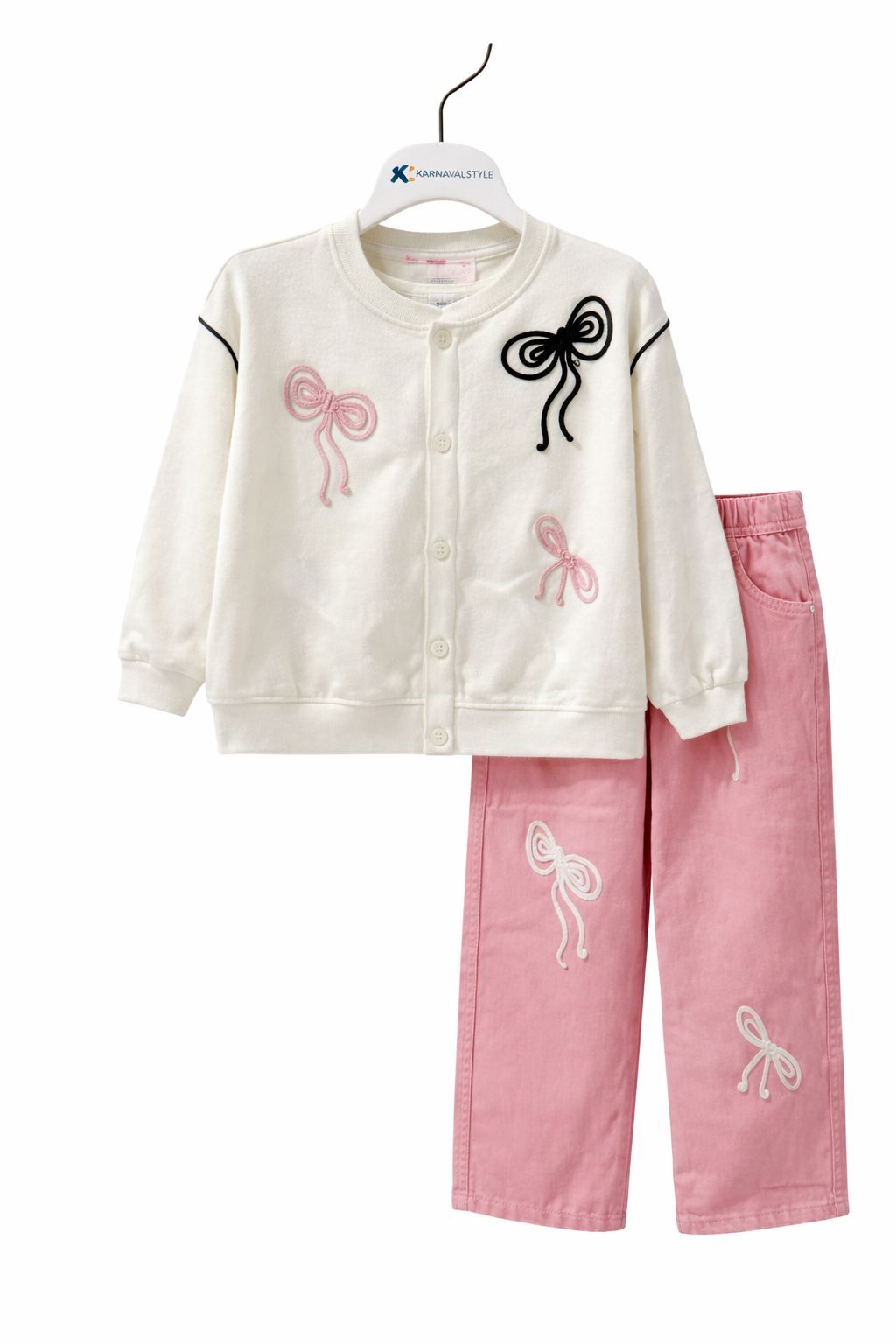 Fiyonk işlemeli triko hırka sweatshirt ve pantolon takımı, şıklığı ve rahatlığı bir arada sunar. Yumuşak dokusu ve kaliteli kumaşıyla gün boyu konfor sağlar. Fiyonk detayları sayesinde zarif bir görünüm elde edilir. Günlük ve özel anlar için ideal, modaya uygun bir tercih.