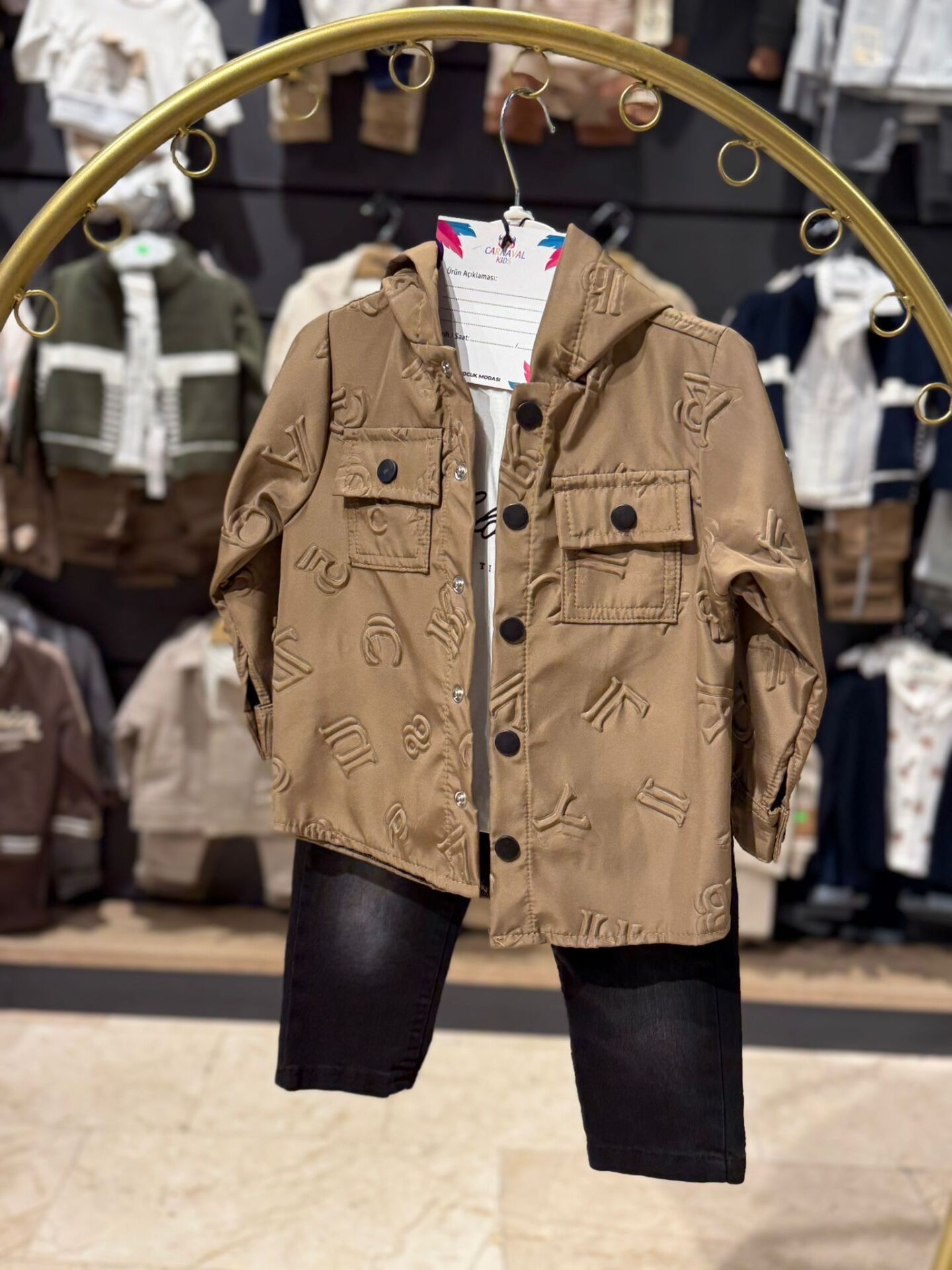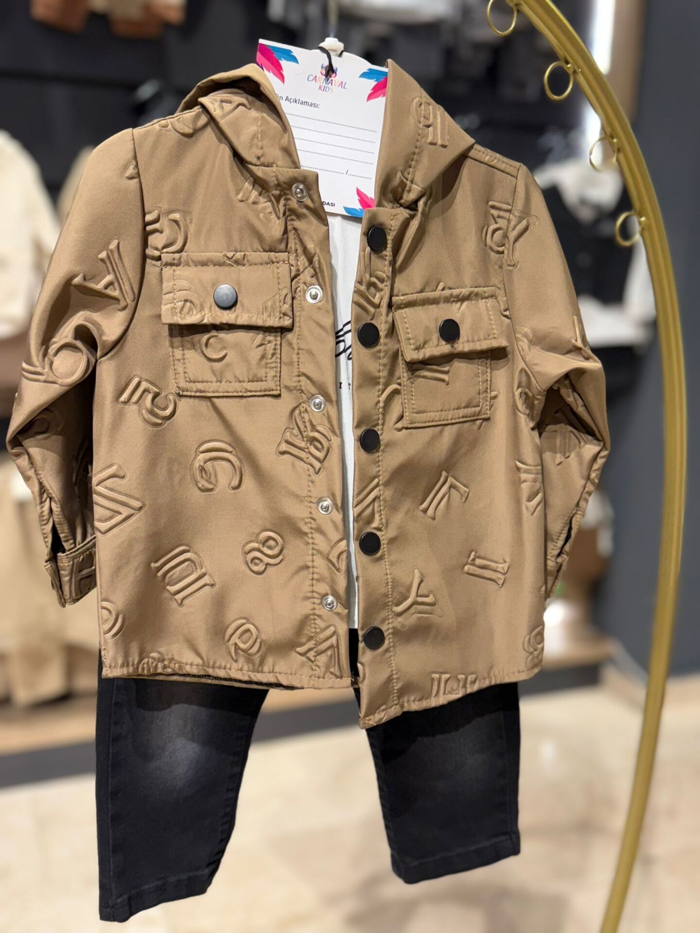 Doğal toprak tonlarında tasarlanan bu çocuk takımı, üzerindeki kabartma desenleriyle sade ama dikkat çekici bir görünüm sunar. Hafif ve yumuşak dokulu ceket, çocukların gün boyu rahat hareket etmesine olanak tanırken düğme ve cep detayları tasarıma şıklık katar. Siyah pantolon ile uyumlu şekilde kombinlenen bu takım, günlük kullanıma uygun olduğu kadar özel günlerde de tercih edilebilecek zamansız ve modern bir seçenektir.