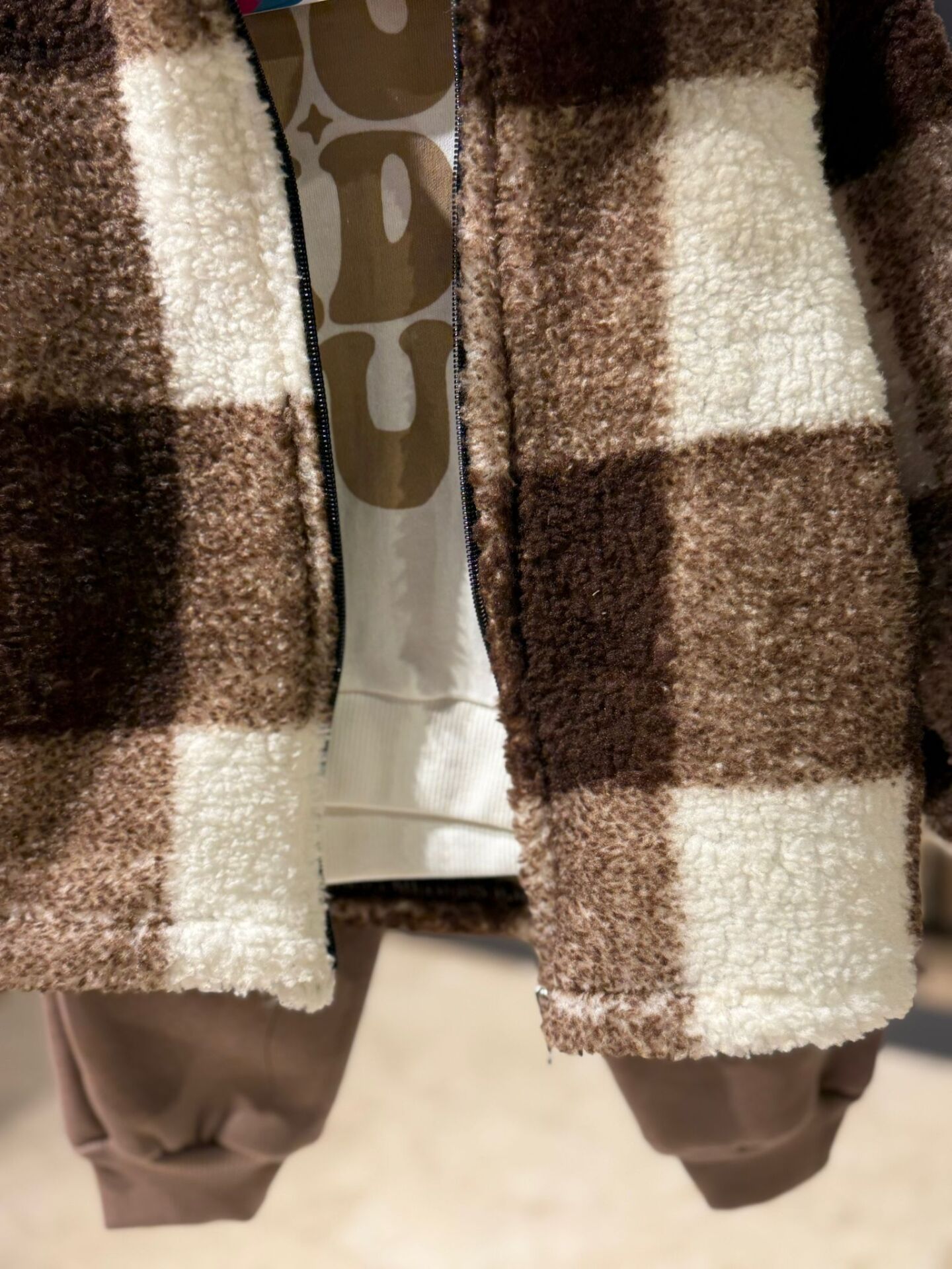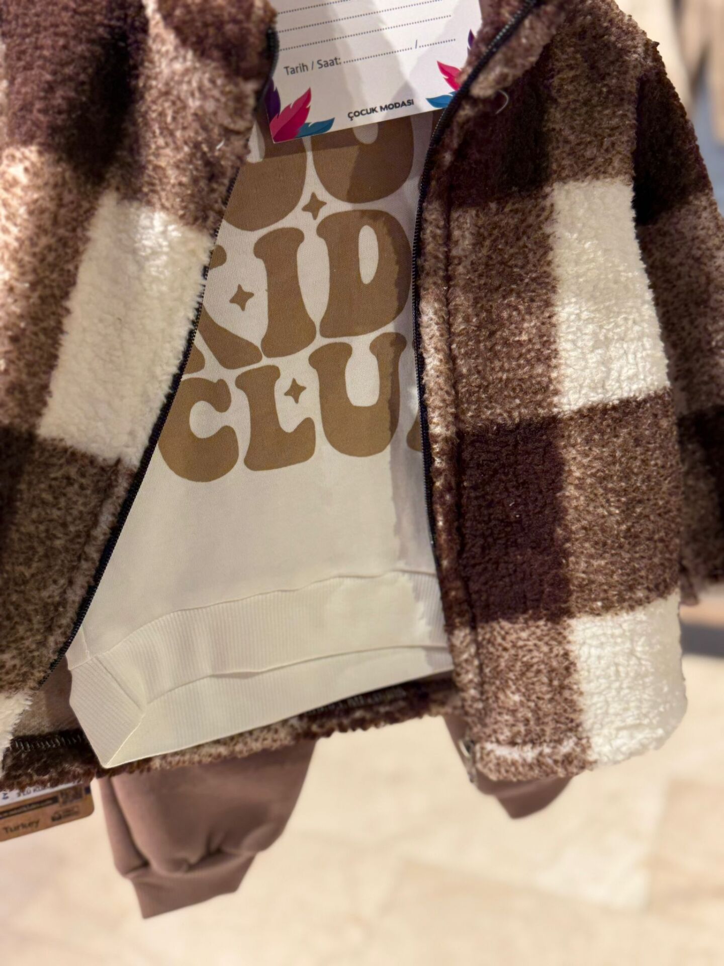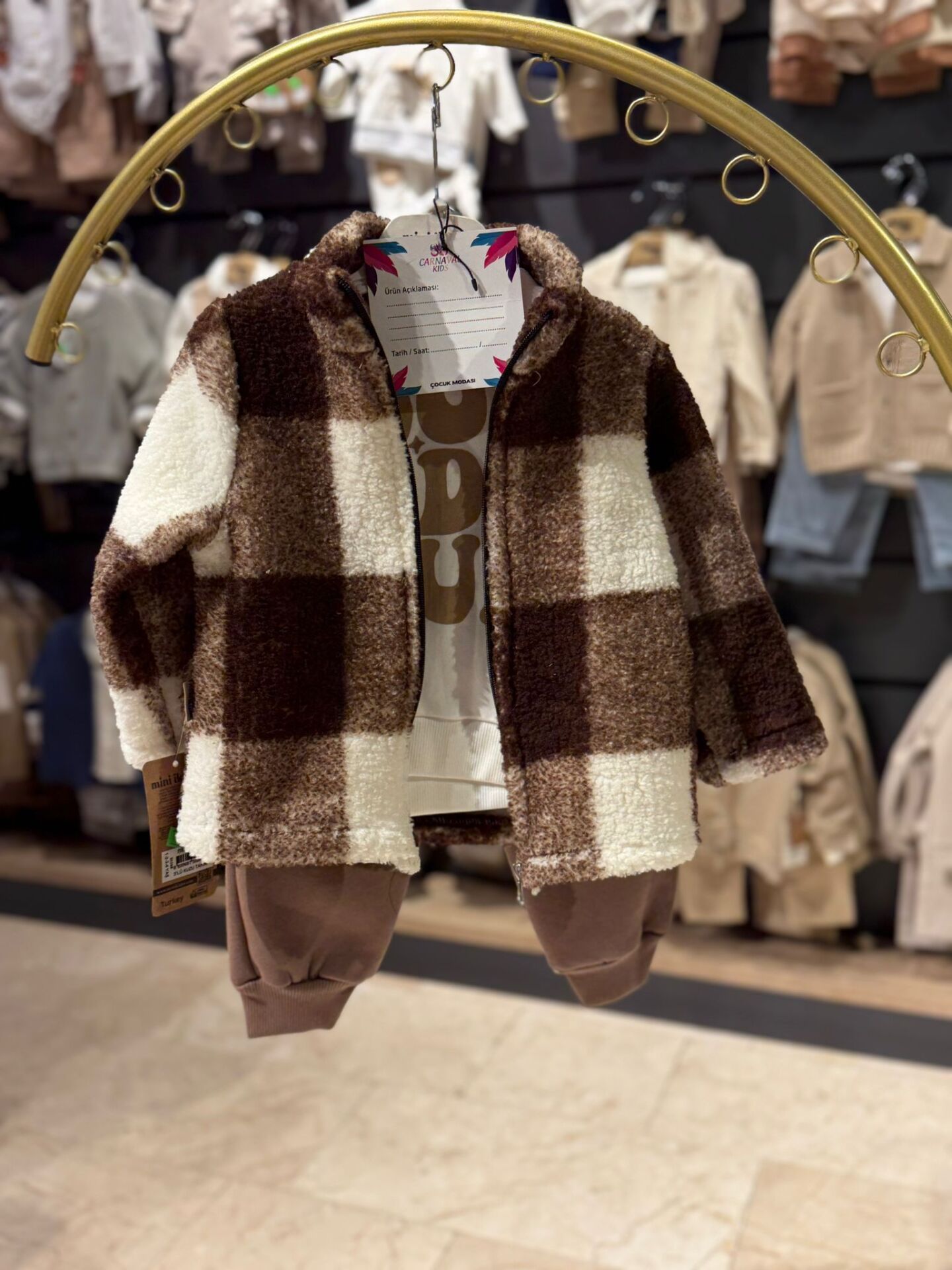 Doğal kahverengi ve ekru tonlarının zarif uyumuyla tasarlanan bu takım, 1–4 yaş aralığındaki çocuklar için konfor ve şıklığı bir arada sunar. Yumuşak dokulu kareli ceket serin havalarda sıcak tutarken, modern kesimiyle estetik bir görünüm sağlar. İç kısmındaki pamuklu üst hassas ciltler için rahat bir kullanım sunarken, esnek yapılı pantolon hareket özgürlüğü sağlayarak gün boyu konfor vadeder. Özenle düşünülmüş detayları ve zamansız tasarımı sayesinde bu takım, günlük kullanımdan özel anlara kadar farklı kombinlerde rahatlıkla tercih edilebilir.