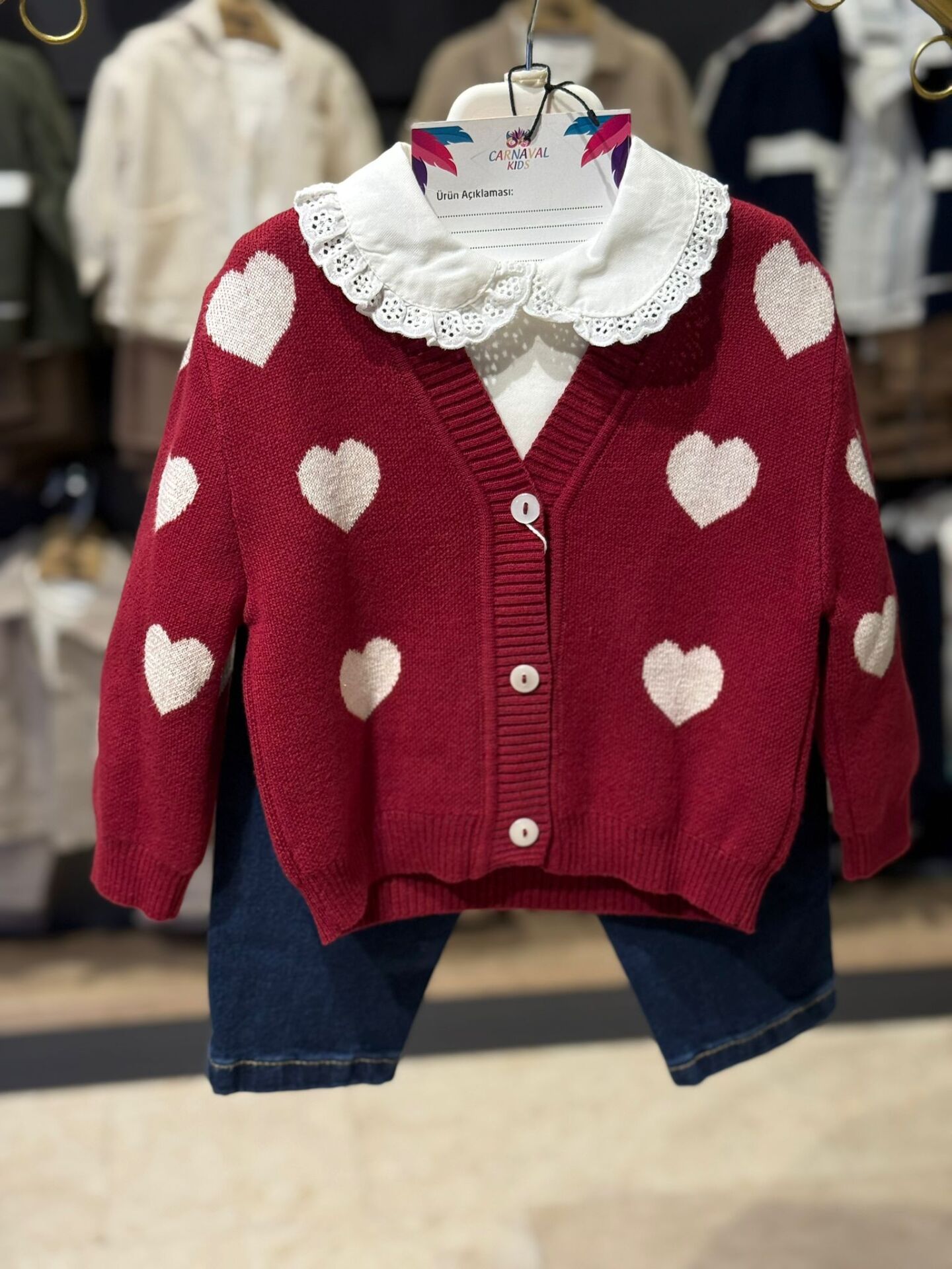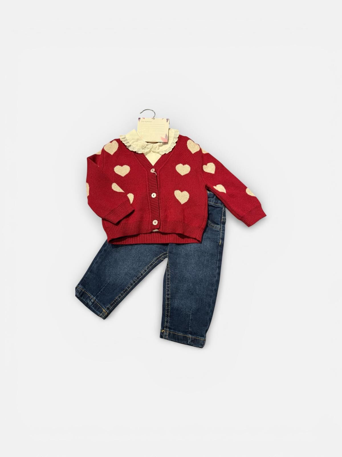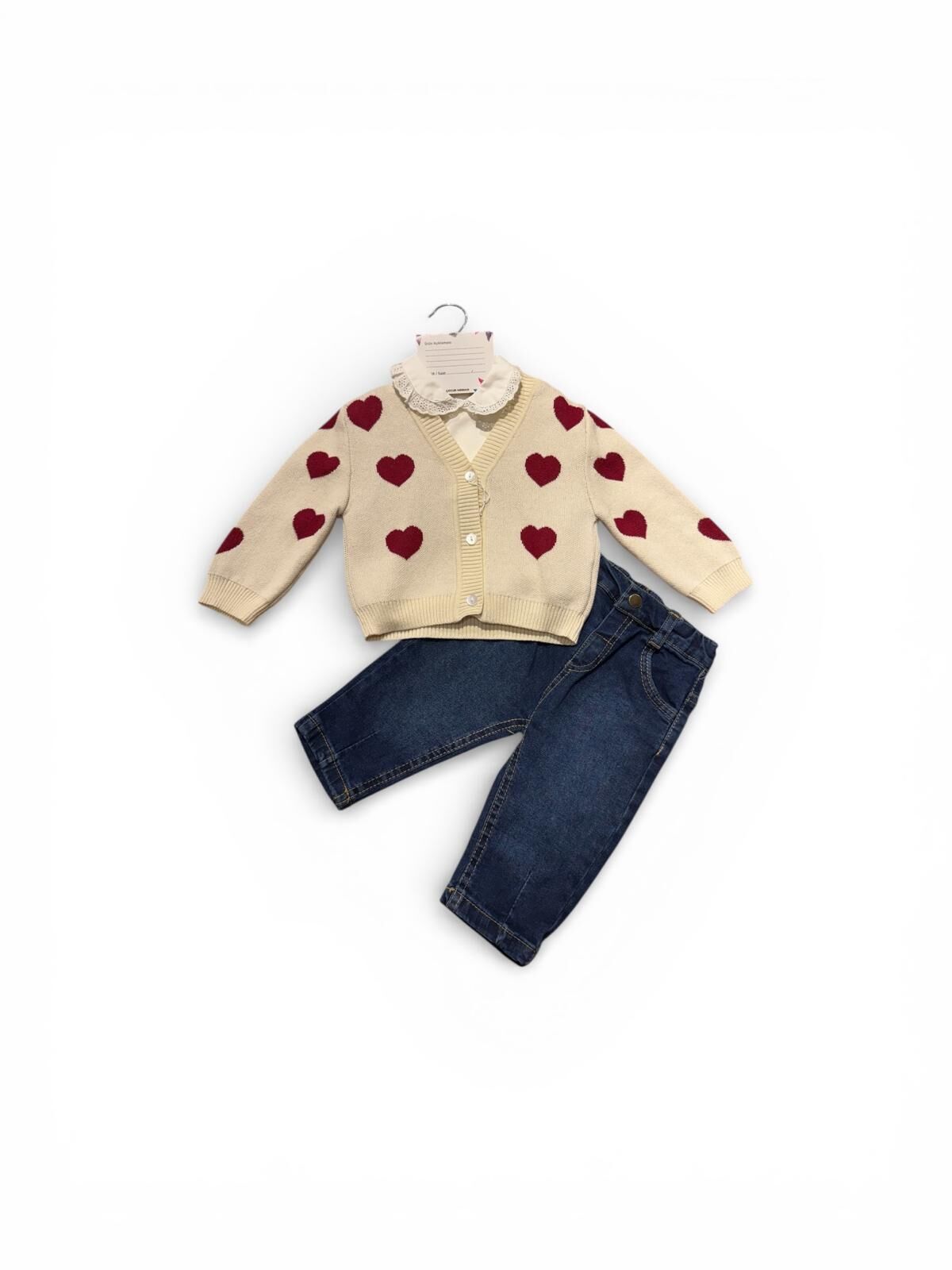Kalp Desenli Triko Hırka & Gömlek & Jean Pantolon Kız Çocuk 3’lü Takım