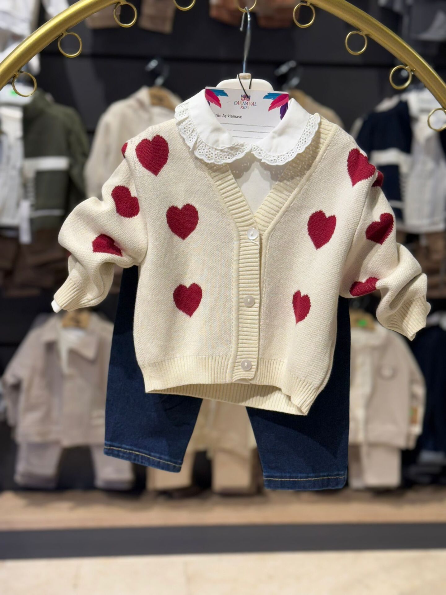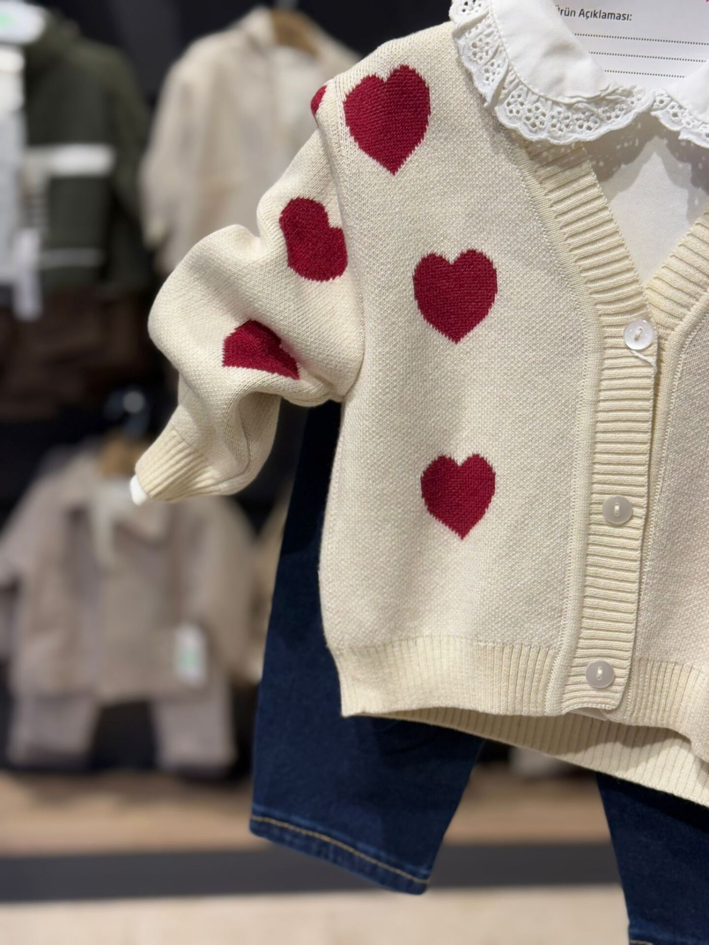 • Kalp desenli, yumuşak ve sıcak tutan triko hırka