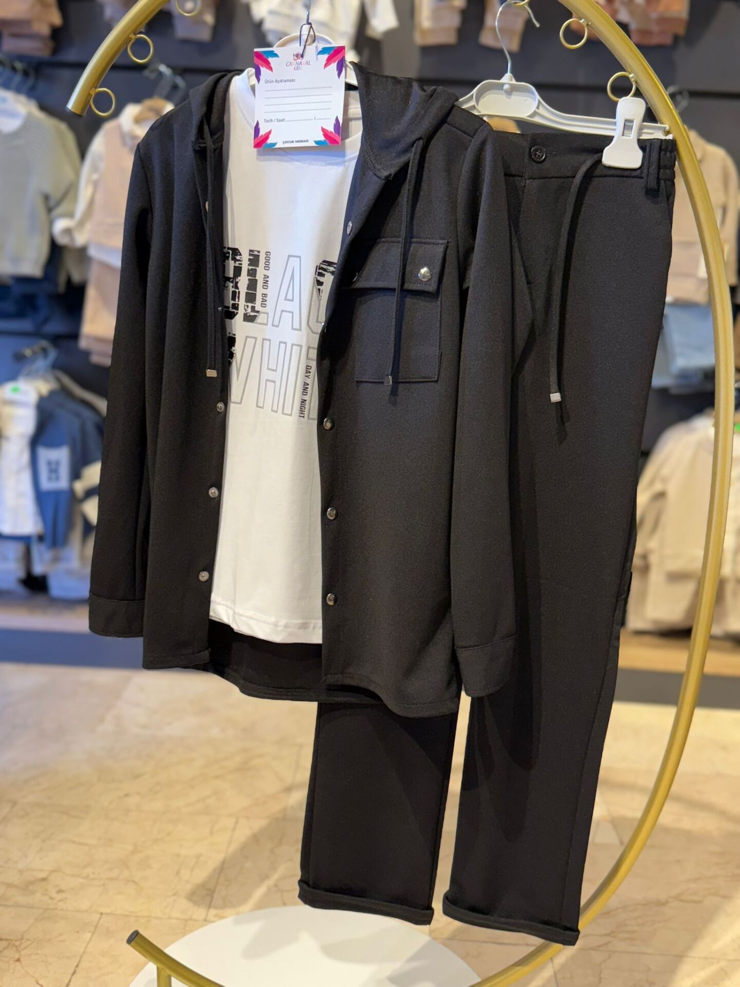 Şık ve sade tasarımıyla dikkat çeken çocuk takımı, kapüşonlu düğmeli üst ve uyumlu pantolondan oluşur. Yumuşak dokulu ve rahat kesimli yapısı sayesinde gün boyu konfor sunar. Üst parçada yer alan kapüşon ve cep detayı modern bir görünüm kazandırırken, belden bağlamalı pantolon rahat bir kullanım sağlar. Günlük kullanım için ideal olan bu takım, hem spor hem de casual kombinlerde rahatlıkla tercih edilebilir.