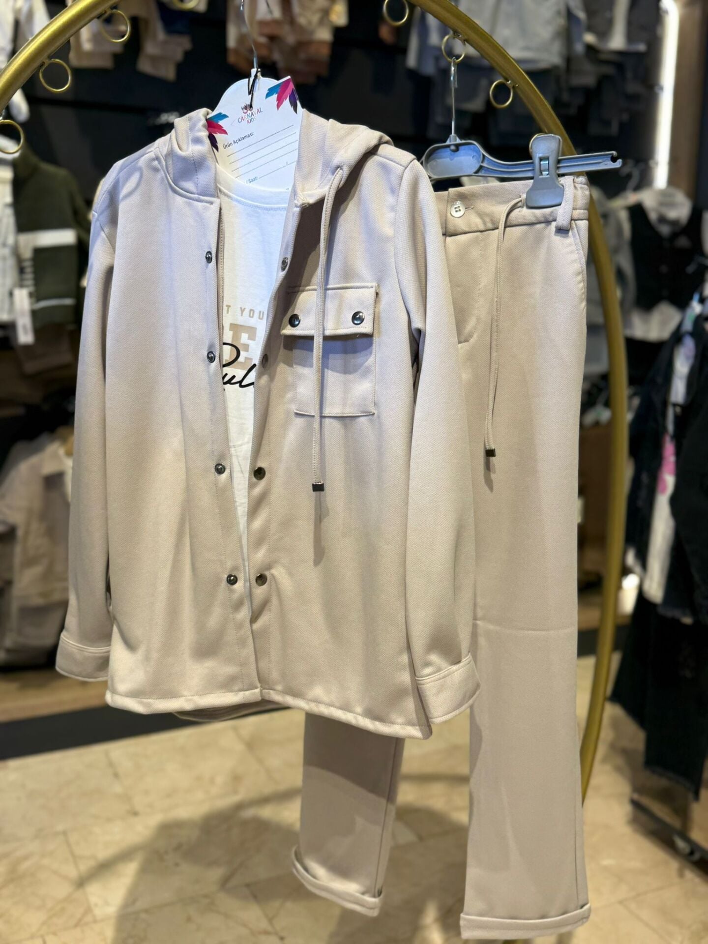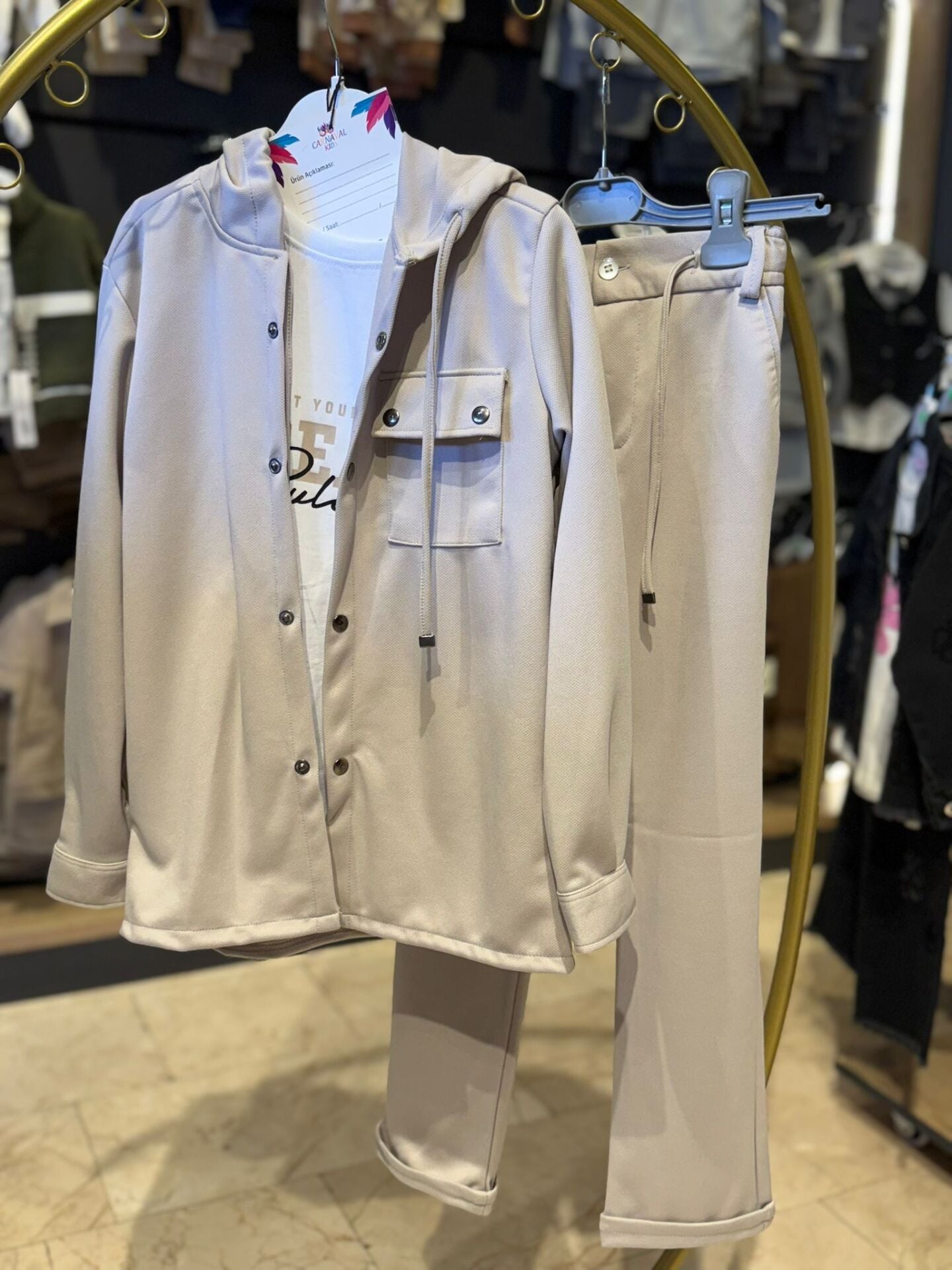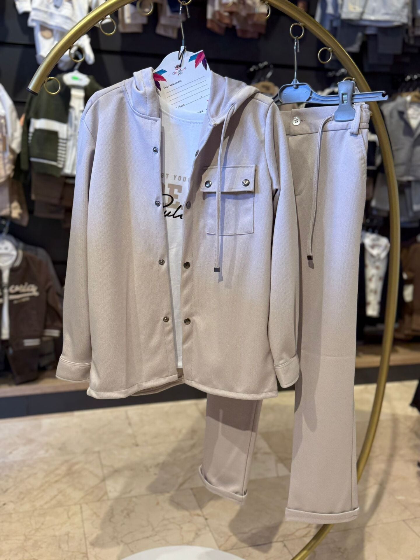 Şık ve sade tasarımıyla dikkat çeken bu bej çocuk takımı, kapüşonlu düğmeli üst ve uyumlu pantolondan oluşur. Yumuşak dokulu ve rahat kesimli yapısı sayesinde gün boyu konfor sunar. Üst parçada yer alan kapüşon ve cep detayı modern bir görünüm kazandırırken, belden bağlamalı pantolon rahat bir kullanım sağlar. Günlük kullanım için ideal olan bu takım, hem spor hem de casual kombinlerde rahatlıkla tercih edilebilir.