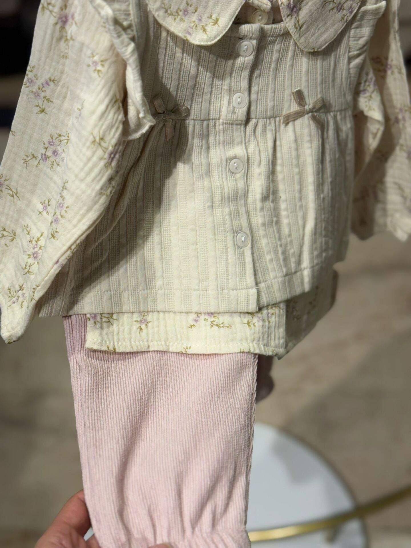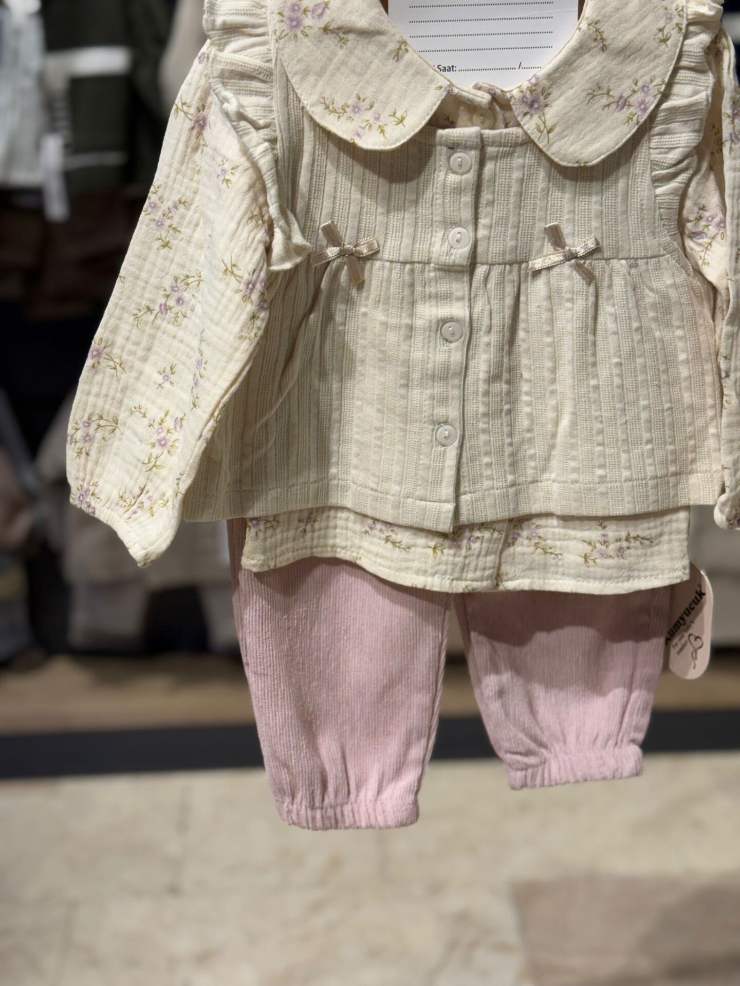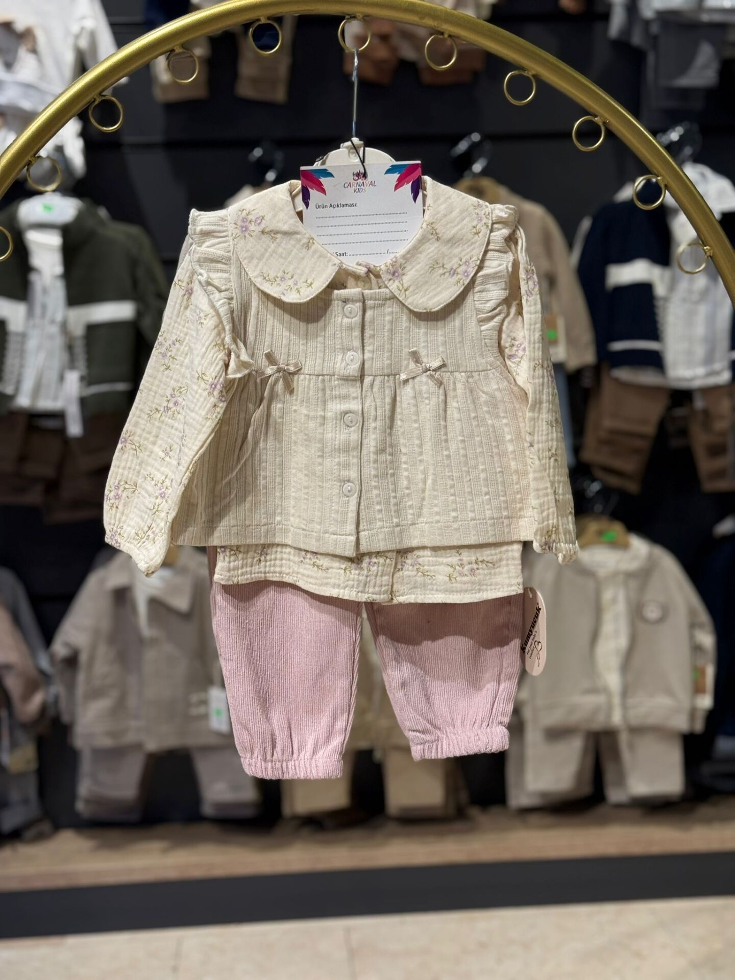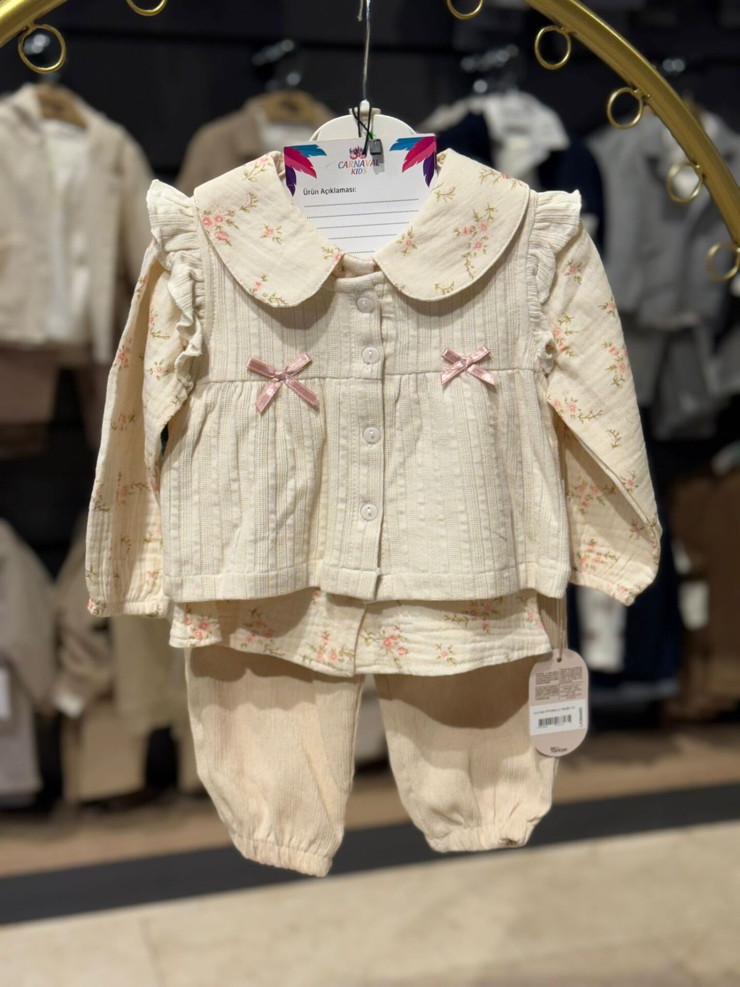Doğal dokusu ve zarif çiçek desenleriyle bebekler için konforlu ve şık bir kombin sunar. Fırfırlı yakaya sahip düğmeli gömleği ve rahat kesim pantolonu sayesinde hem günlük kullanımda hem de özel anlarda tercih edilebilir. Hafif ve nefes alabilen kumaşı, bebeğin hassas cildiyle uyumludur.