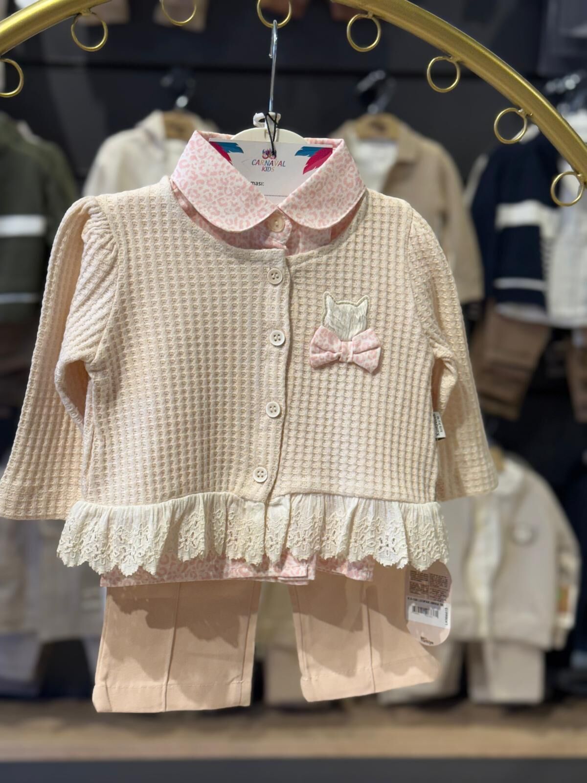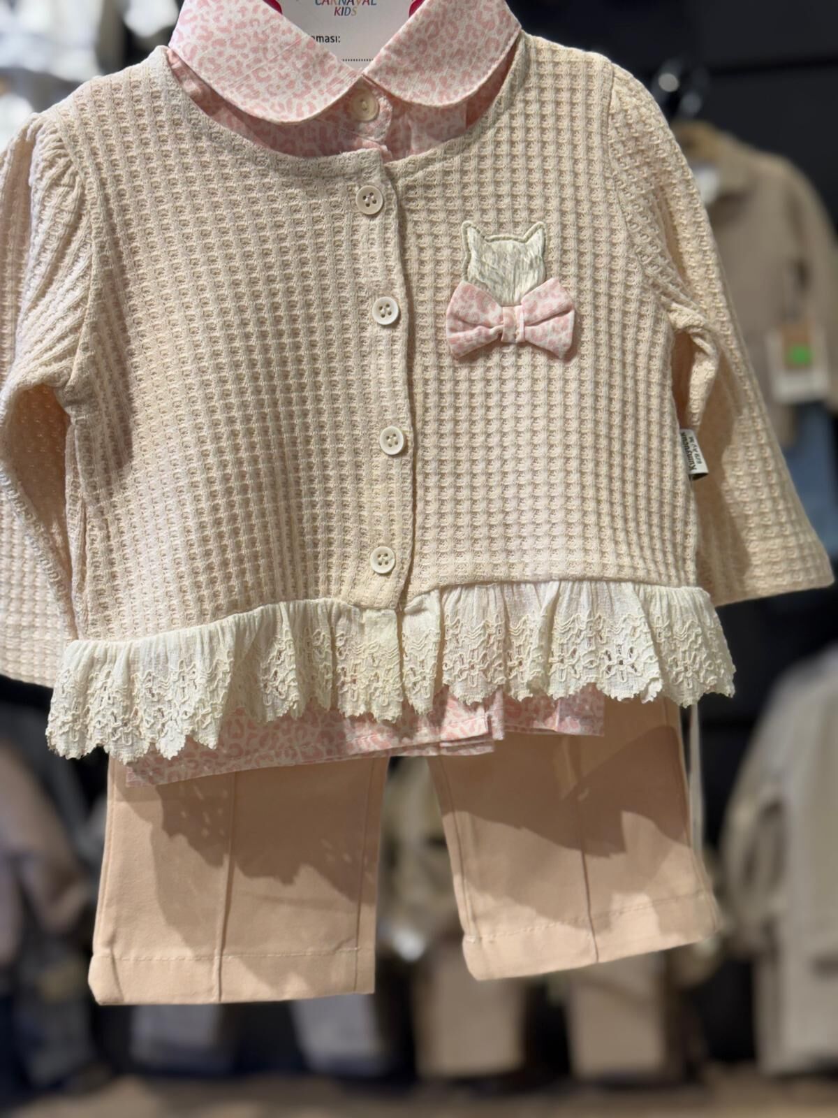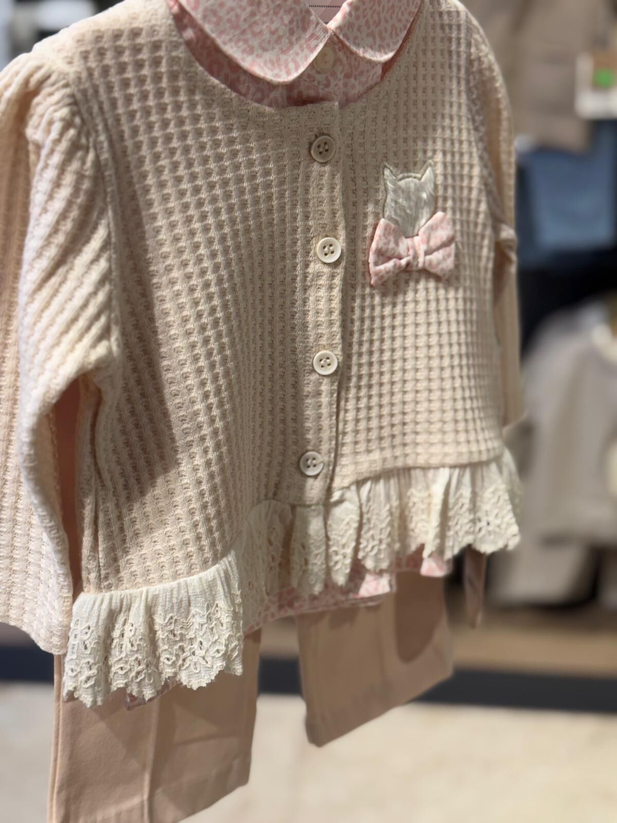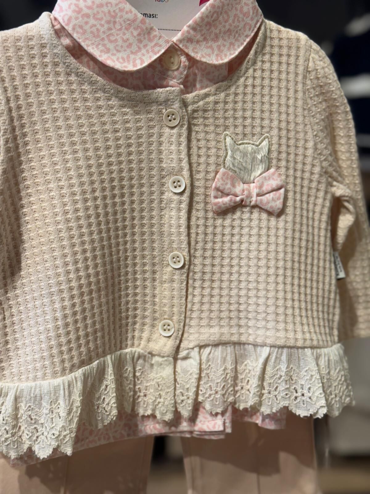 Zarif dokusu ve şık detaylarıyla bebekler için özel olarak tasarlanmış bu 3’lü takım, konfor ve estetiği bir arada sunar. Dantel detaylı hırkası, desenli iç bluzu ve rahat kesim pantolonu ile hem günlük kullanım hem de özel günler için ideal bir tercihtir.