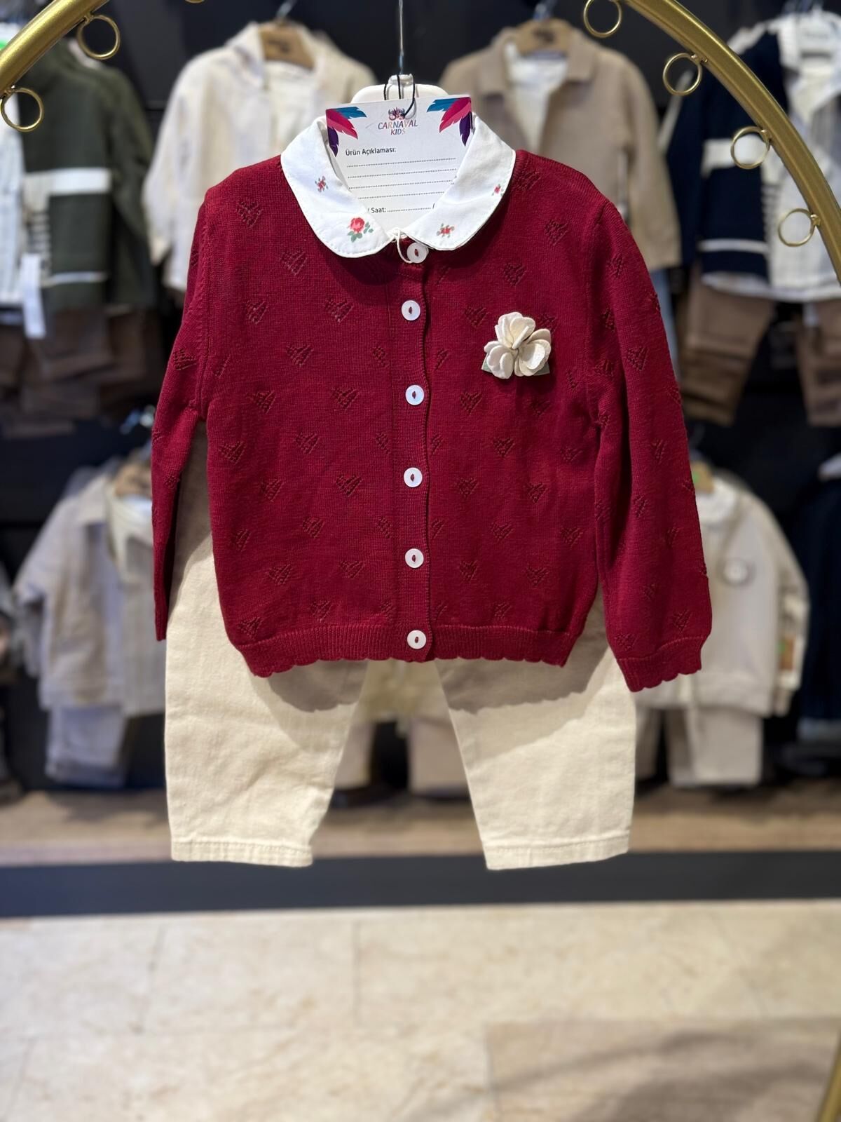 Zarif tasarımı ve yumuşak dokusuyla bebekler için hem şık hem de konforlu bir kombin sunar. Triko hırkanın zarif dokusu ve pantolonun rahat kalıbı sayesinde gün boyu özgür hareket imkânı sağlar. Günlük kullanımda ve özel anlarda güvenle tercih edilebilir.