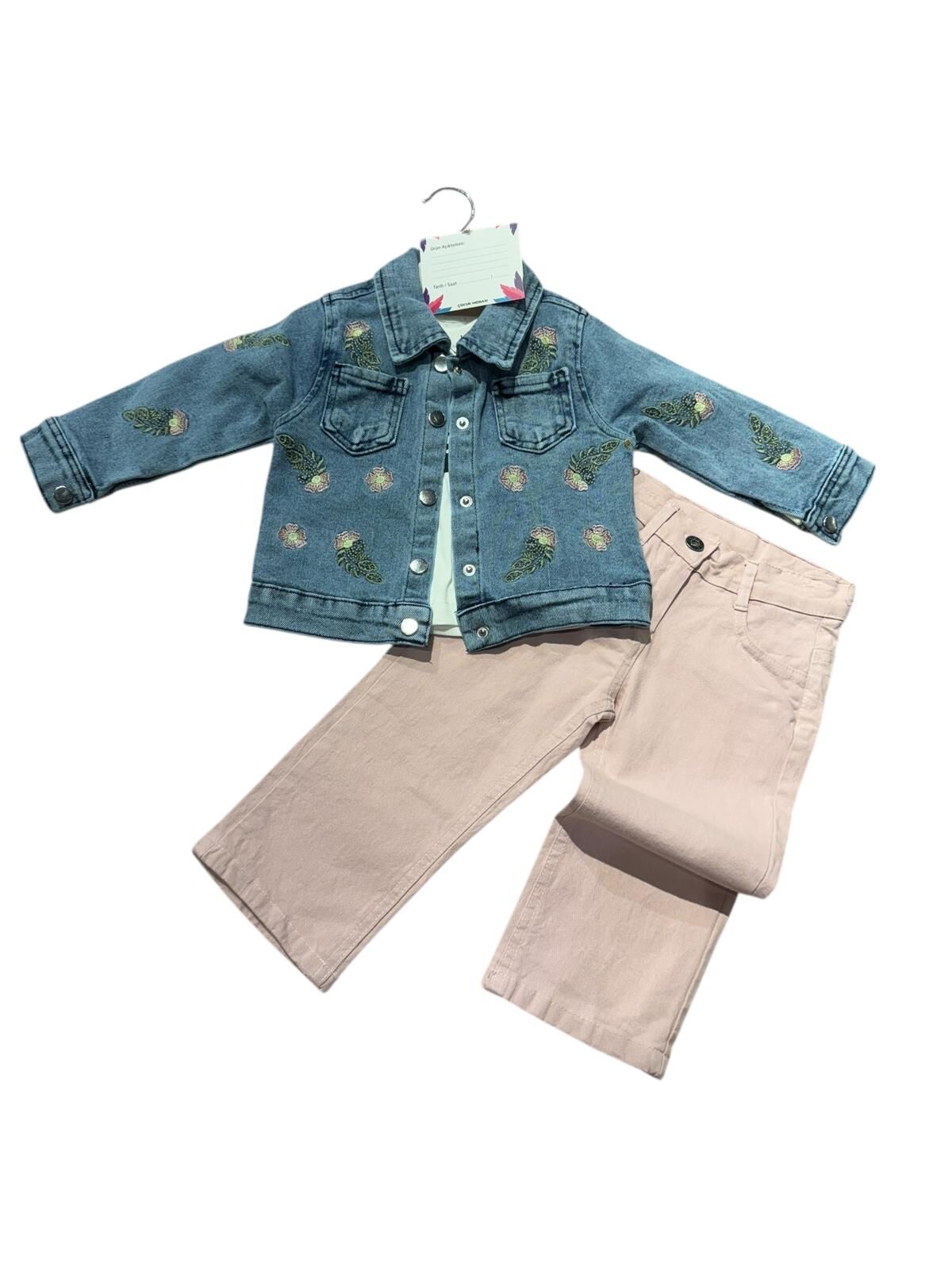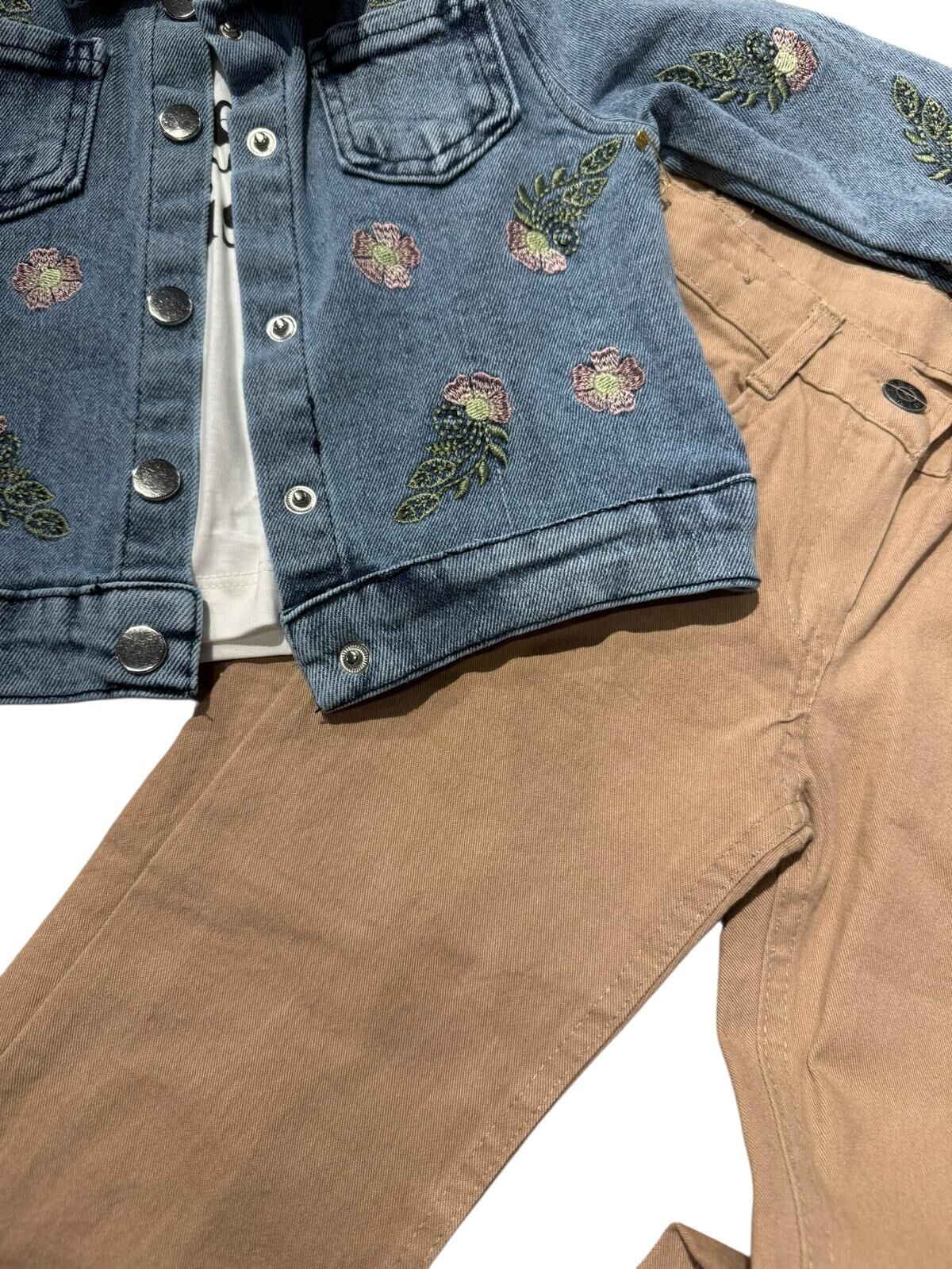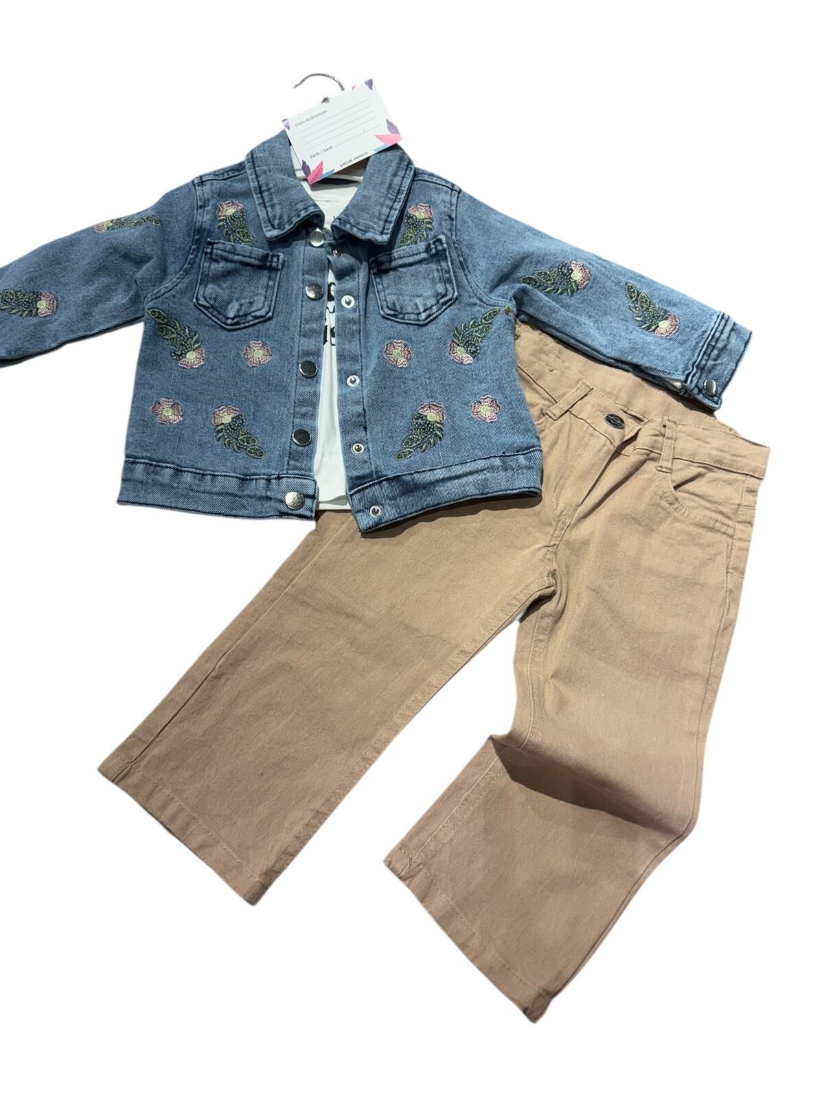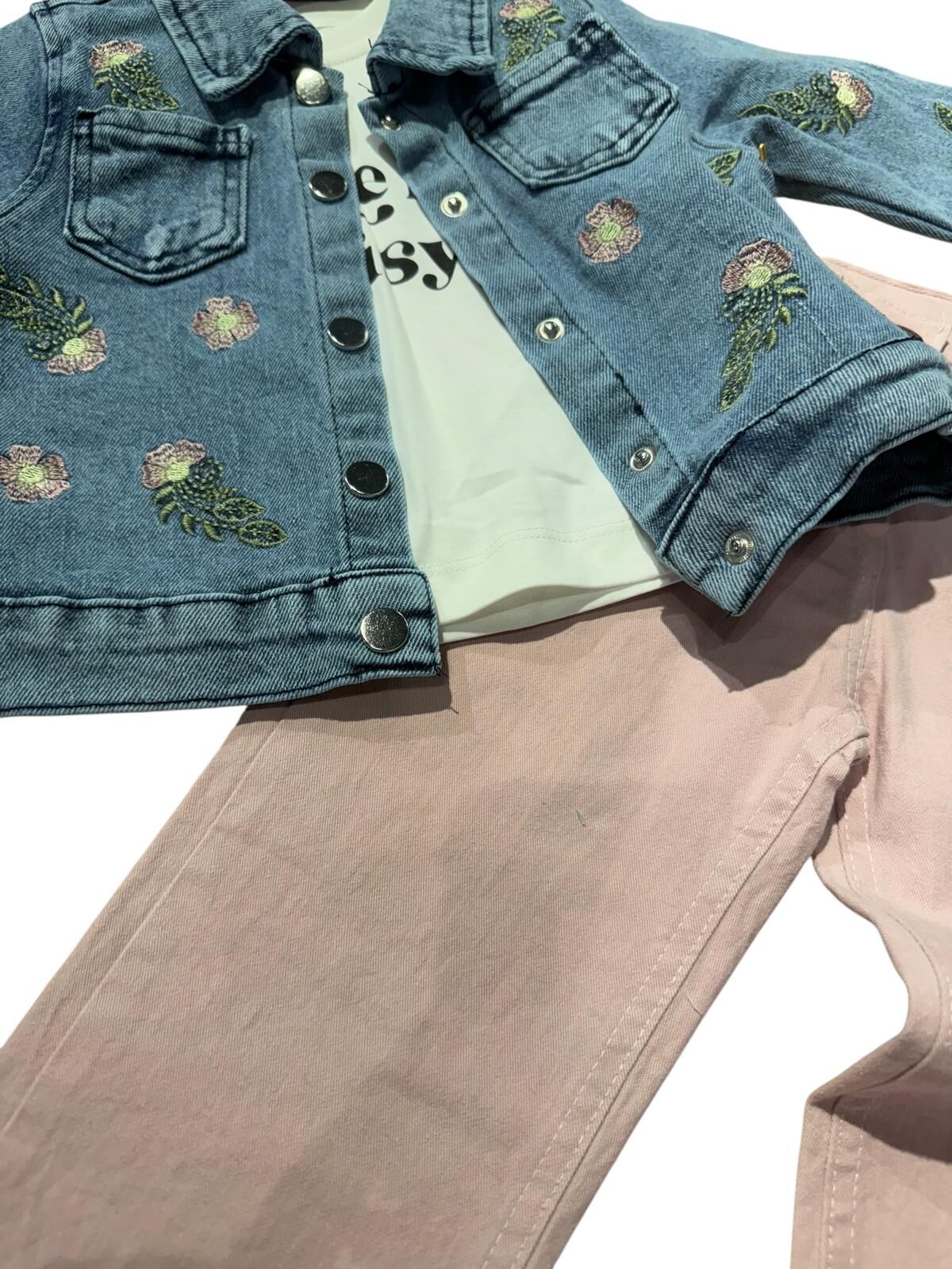 Şık ve modern detaylara sahip 3 parça kız takımı, günlük kullanımda ve özel kombinlerde rahatlıkla tercih edilebilir. Kot ceket üzerindeki zarif desenler takıma hareketli ve şık bir görünüm kazandırır.