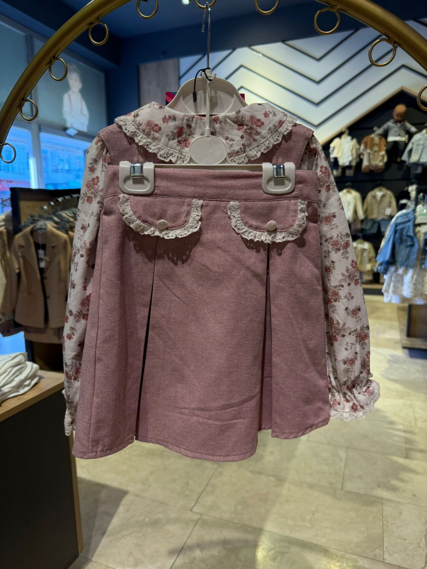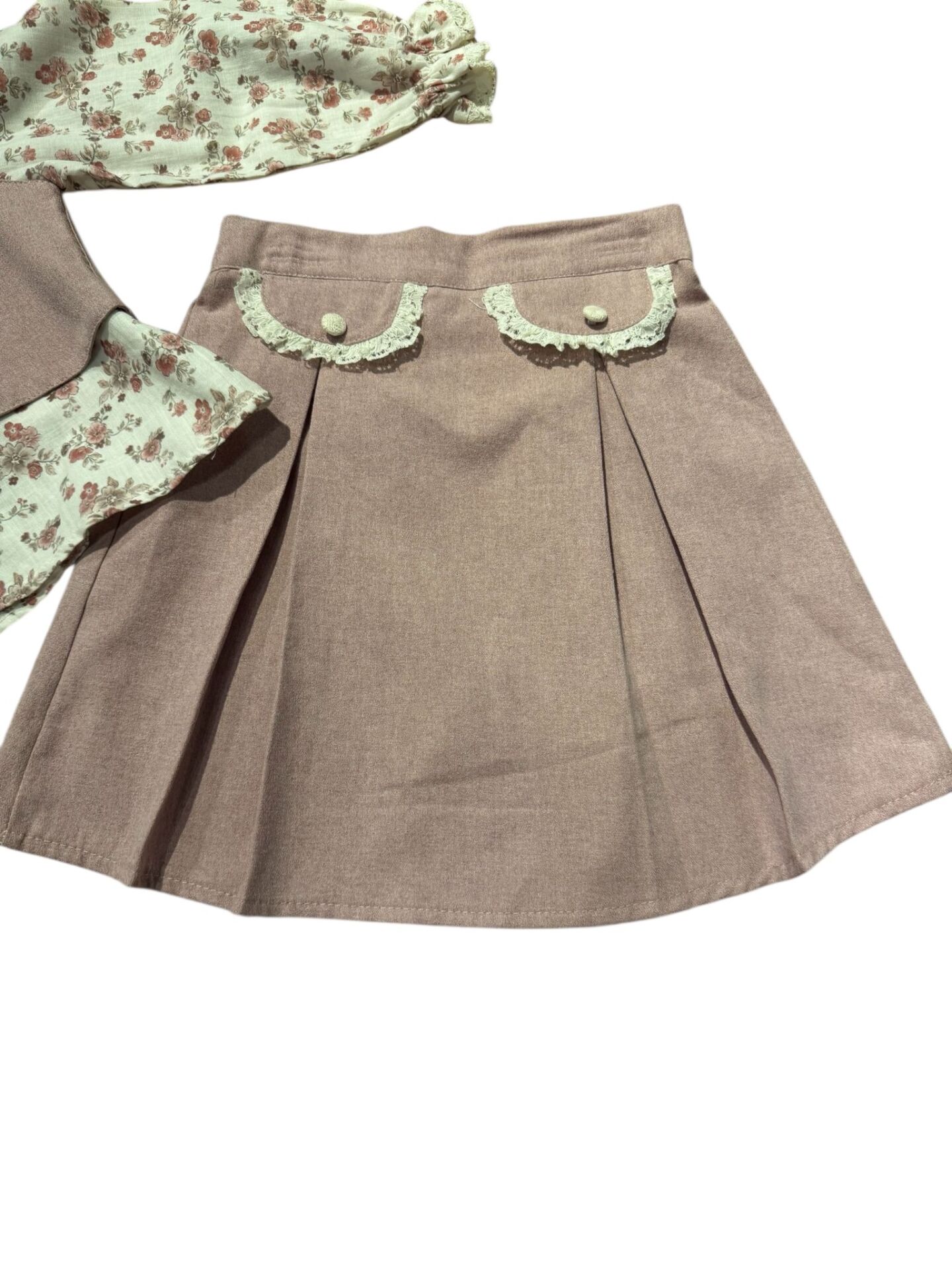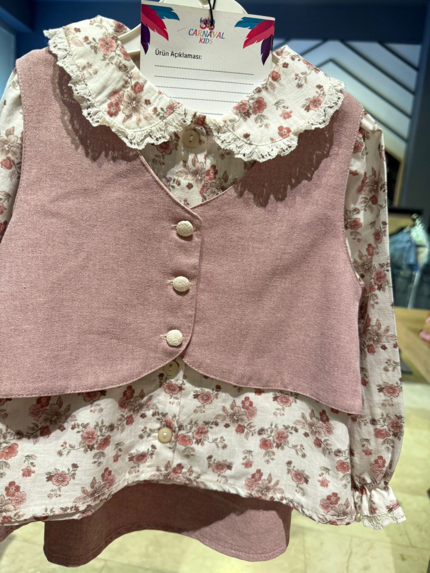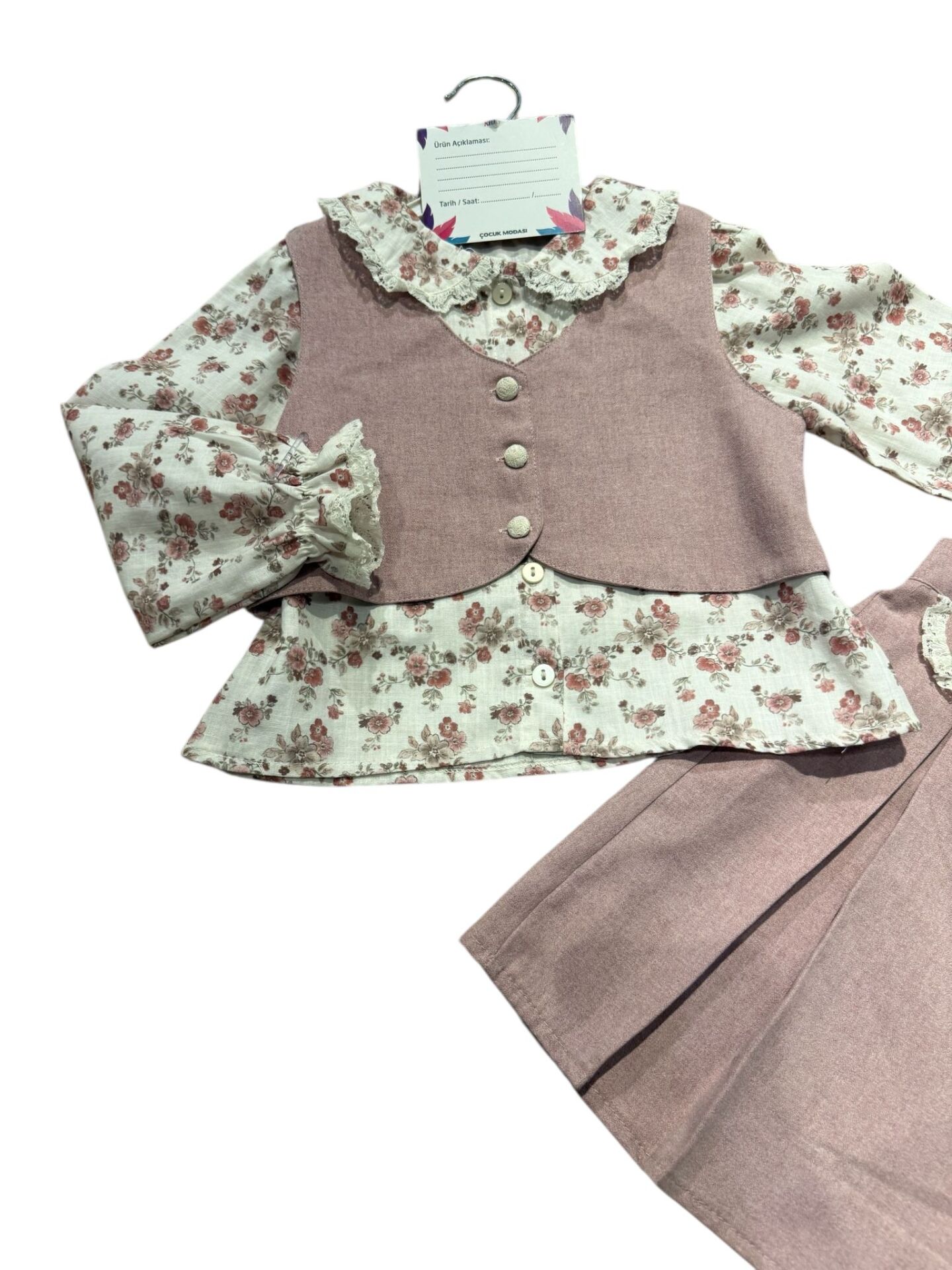 Bluz üzerindeki çiçek desenleri ve dantel yakası takıma romantik bir hava katarken, yelek ve etek kısmındaki uyumlu kumaş yapısı kombini tamamlar. Rahat kalıbı sayesinde çocukların gün boyu konforlu hareket etmesine olanak tanır.