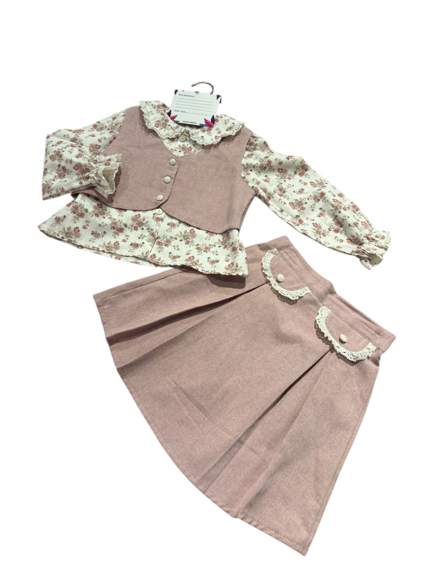 Zarif detayları ve uyumlu renk geçişleriyle öne çıkan bu kız çocuk 3’lü takım, şıklığı ve rahatlığı bir arada sunar. Çiçek desenli uzun kollu bluz, düğmeli yelek ve pile detaylı etekten oluşan set; günlük kombinlerde olduğu kadar özel günlerde de şık bir görünüm sağlar.