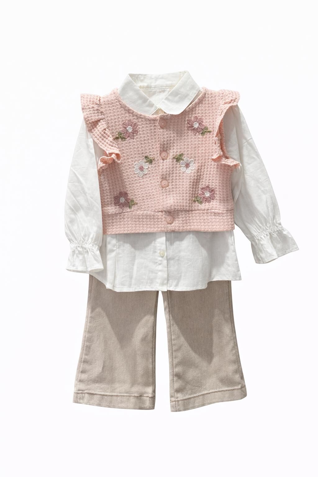 Kız çocukları için tasarlanmış bu şık üçlü takım, zarif çiçek işlemeleriyle dikkat çeker. Yumuşak ve kaliteli kumaşı sayesinde rahat kullanım sunar. Özel günlerde veya günlük kullanıma uygun, hem şıklığı hem konforu bir arada isteyenler için ideal bir seçimdir.
