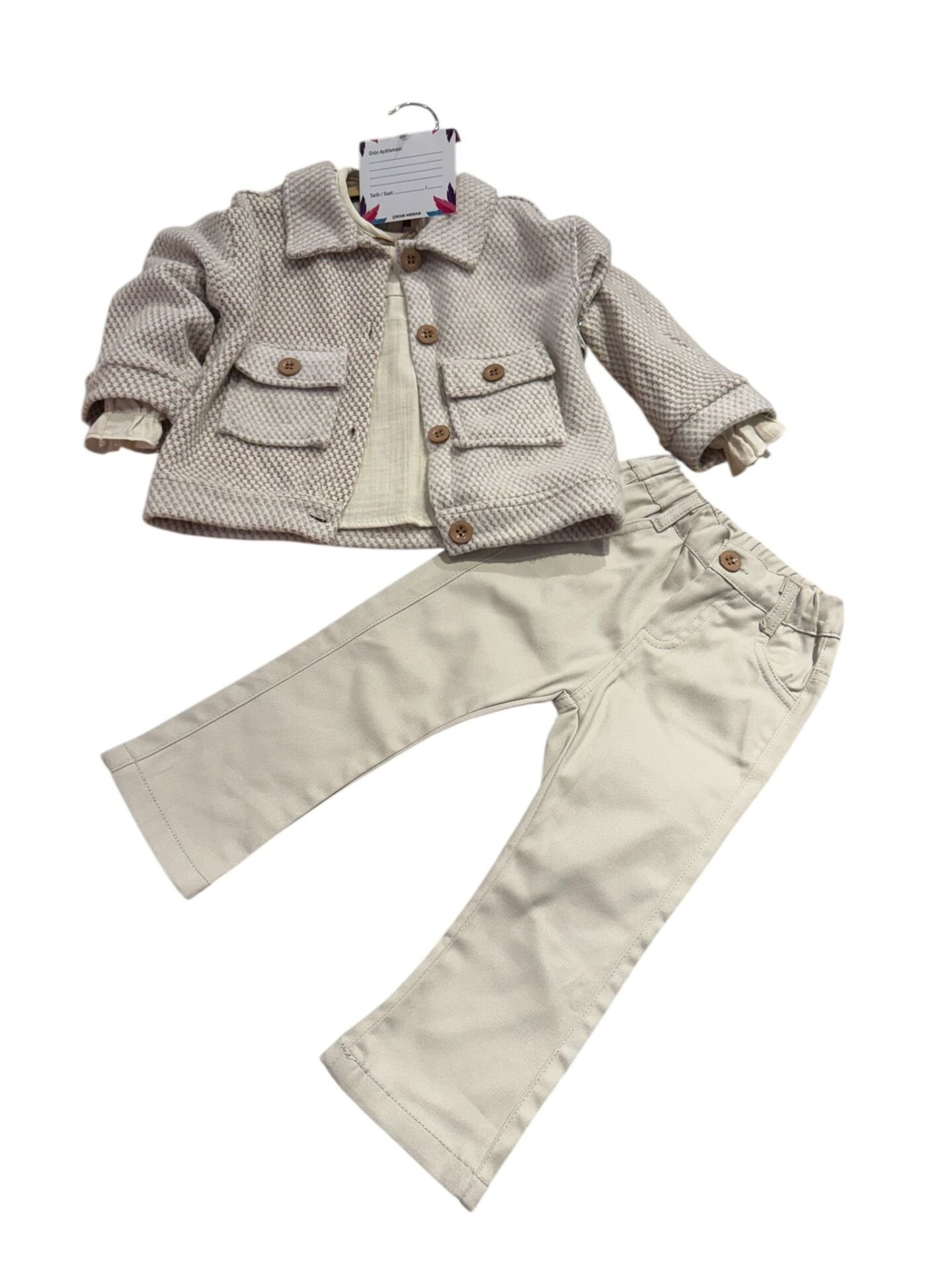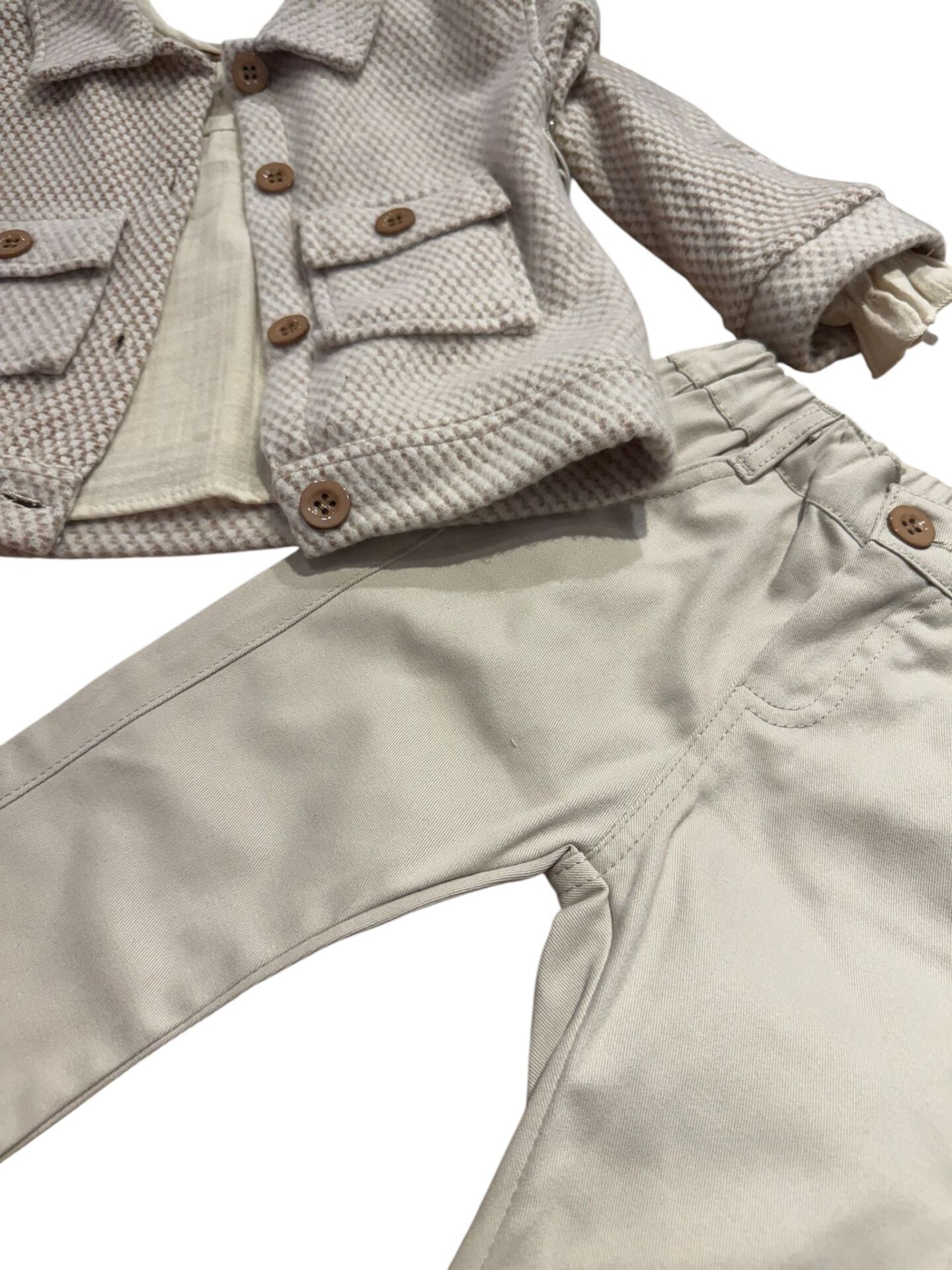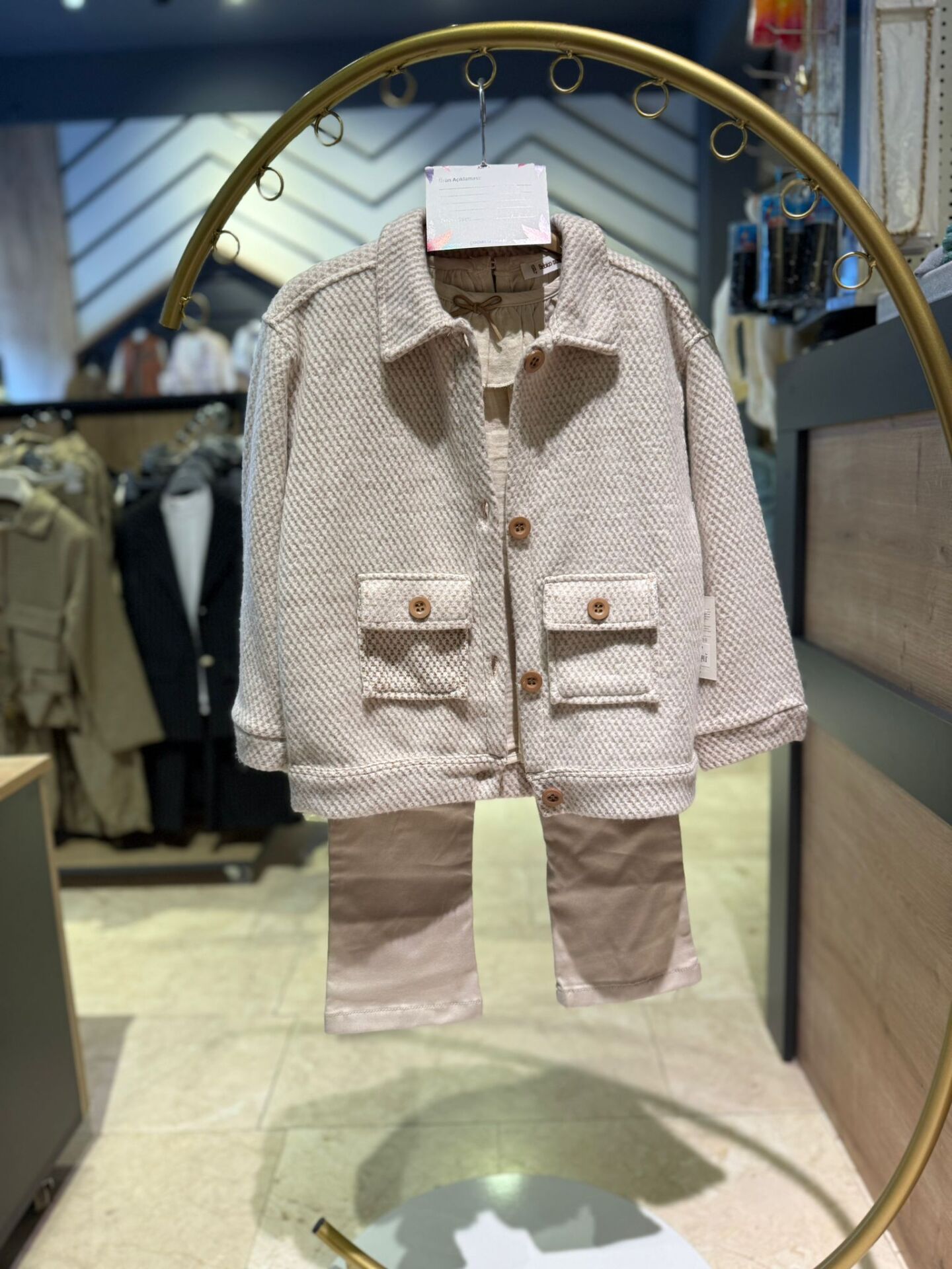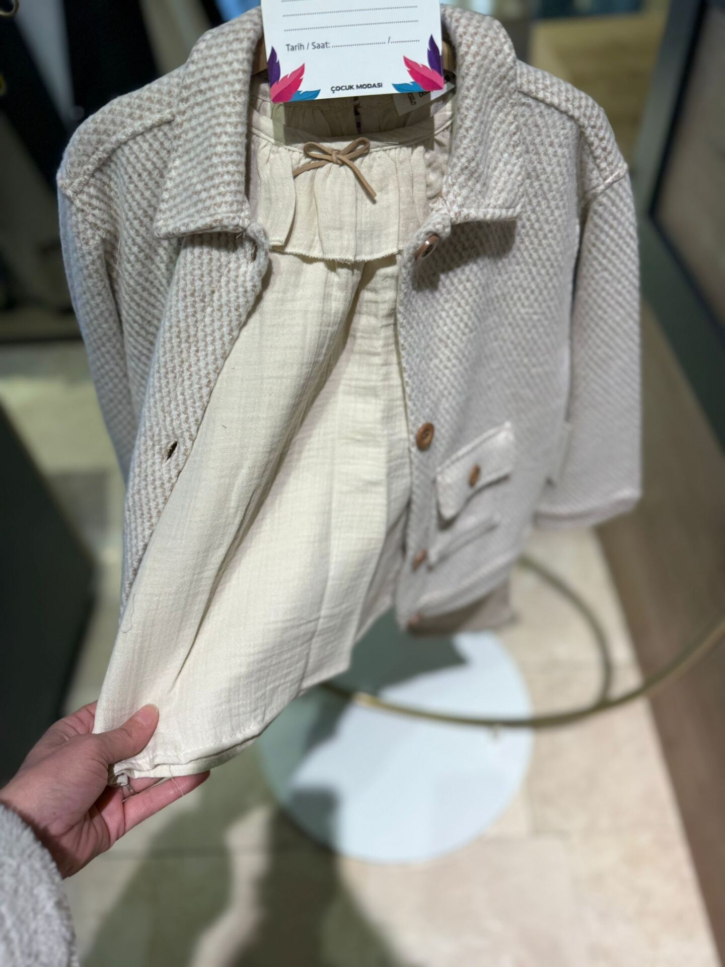 Doğal renk tonları ve şık dokusuyla öne çıkan bu kız çocuk 3’lü takım, zarif ve modern bir stil sunar. Dokulu ceket, hafif kumaşlı iç gömlek ve rahat kesim pantolondan oluşan set; hem günlük kullanım hem de özel gün kombinleri için ideal bir tercihtir.