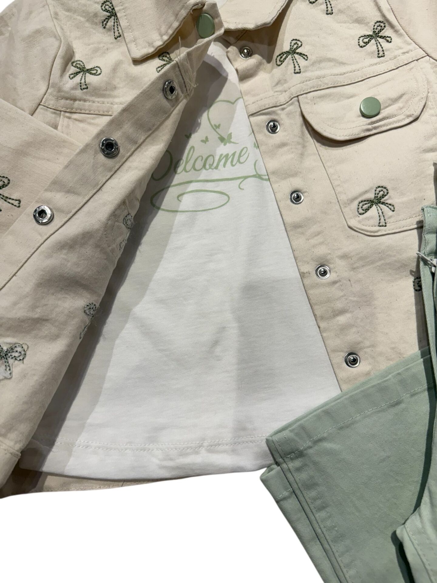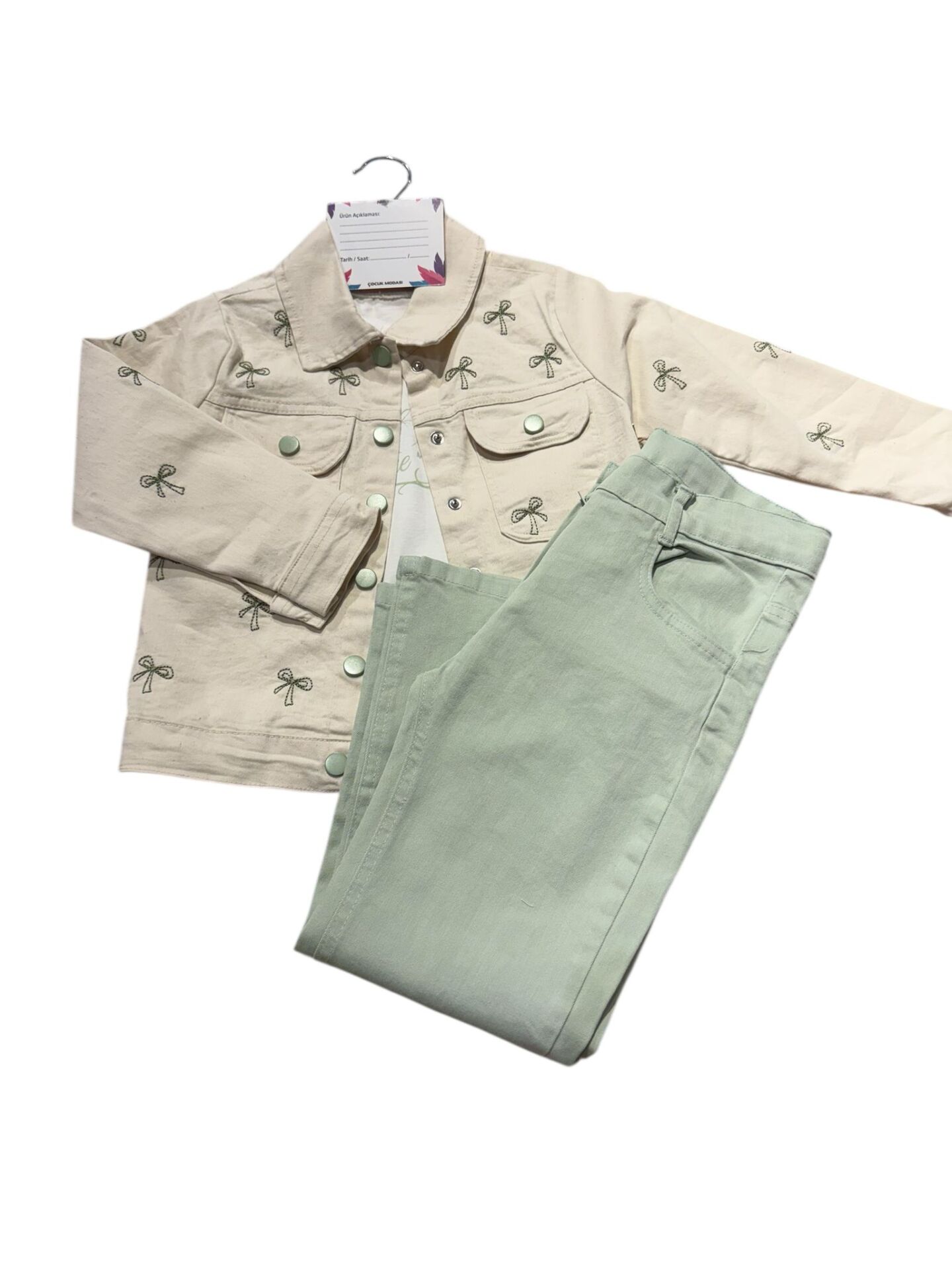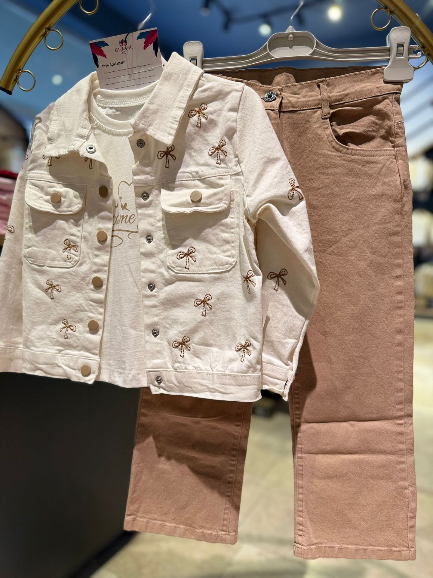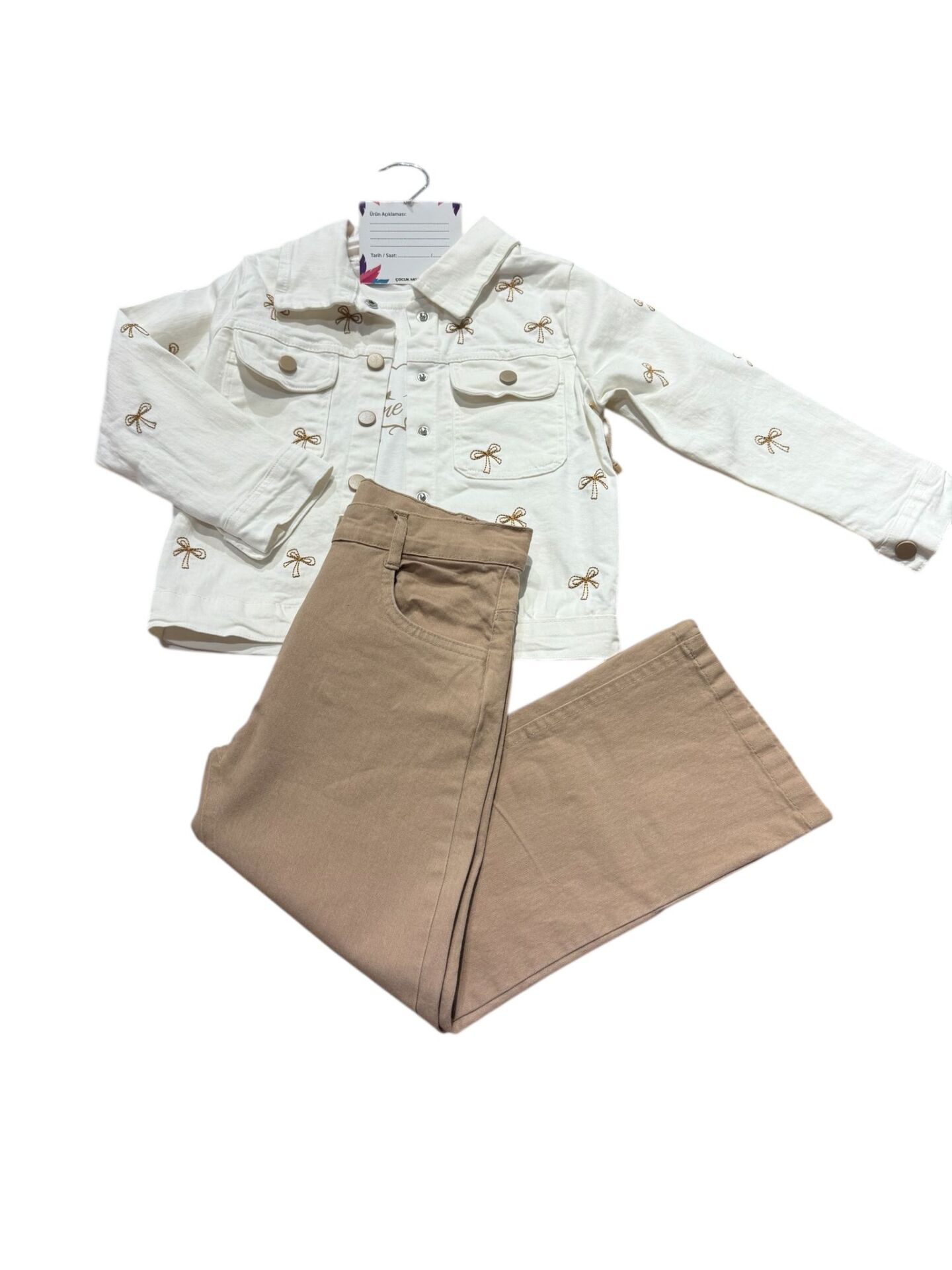 Doğal tonları ve zarif desenleriyle öne çıkan bu kız çocuk 3’lü takım, hem şıklık hem de konfor sunar. Fiyonk desenli ceket, iç tişört ve rahat kesim pantolondan oluşan set; günlük kullanım ve özel kombinler için ideal bir tercihtir.