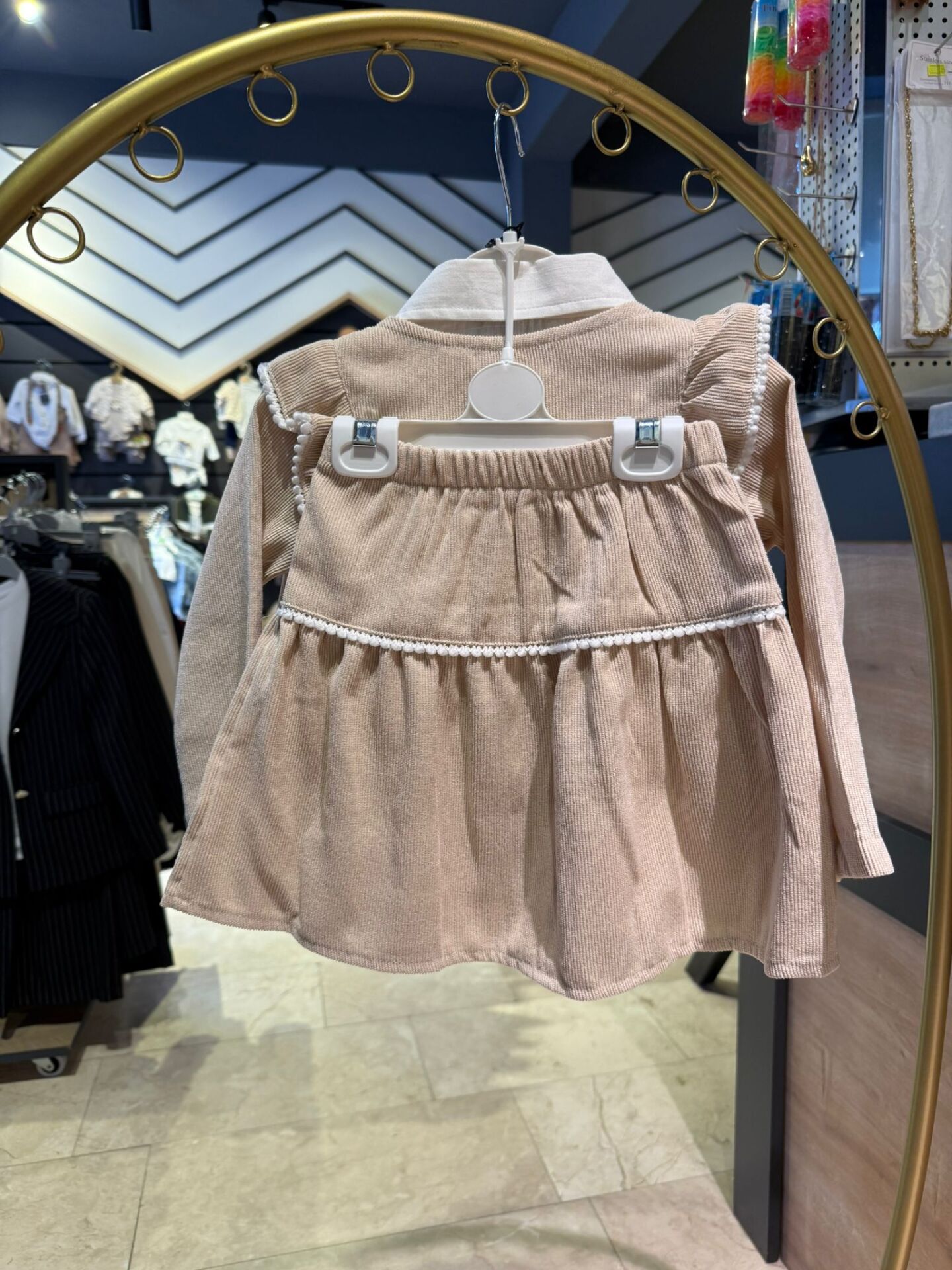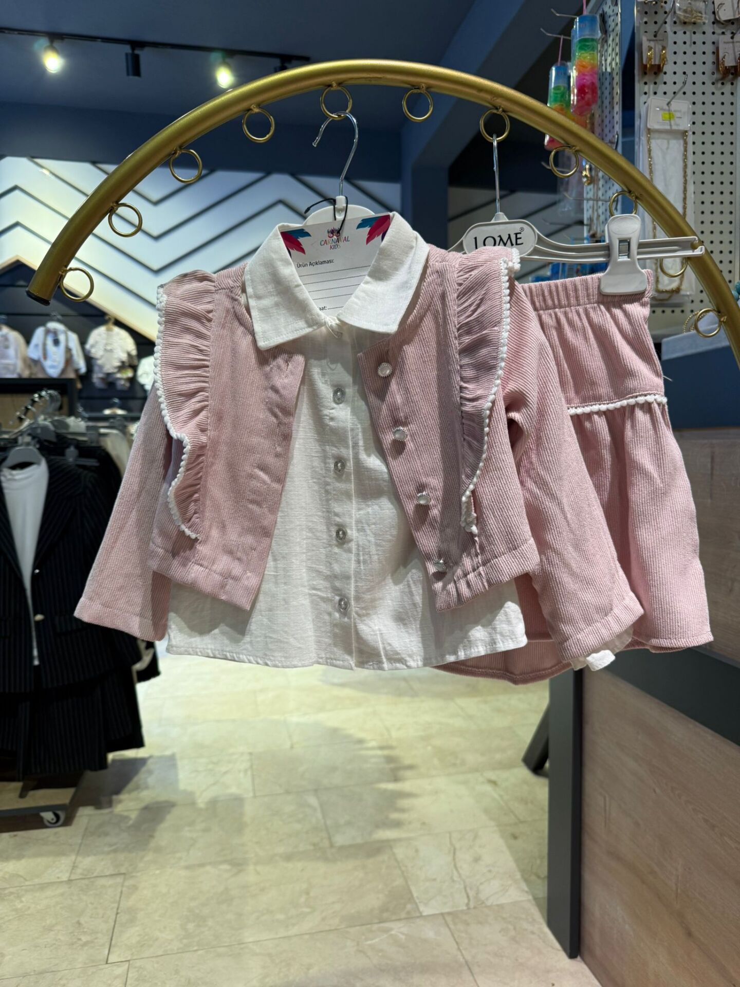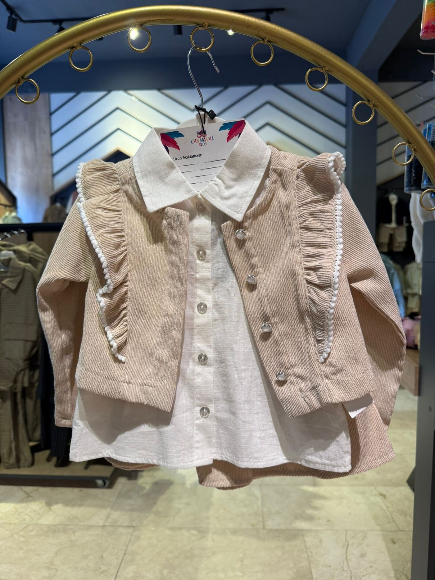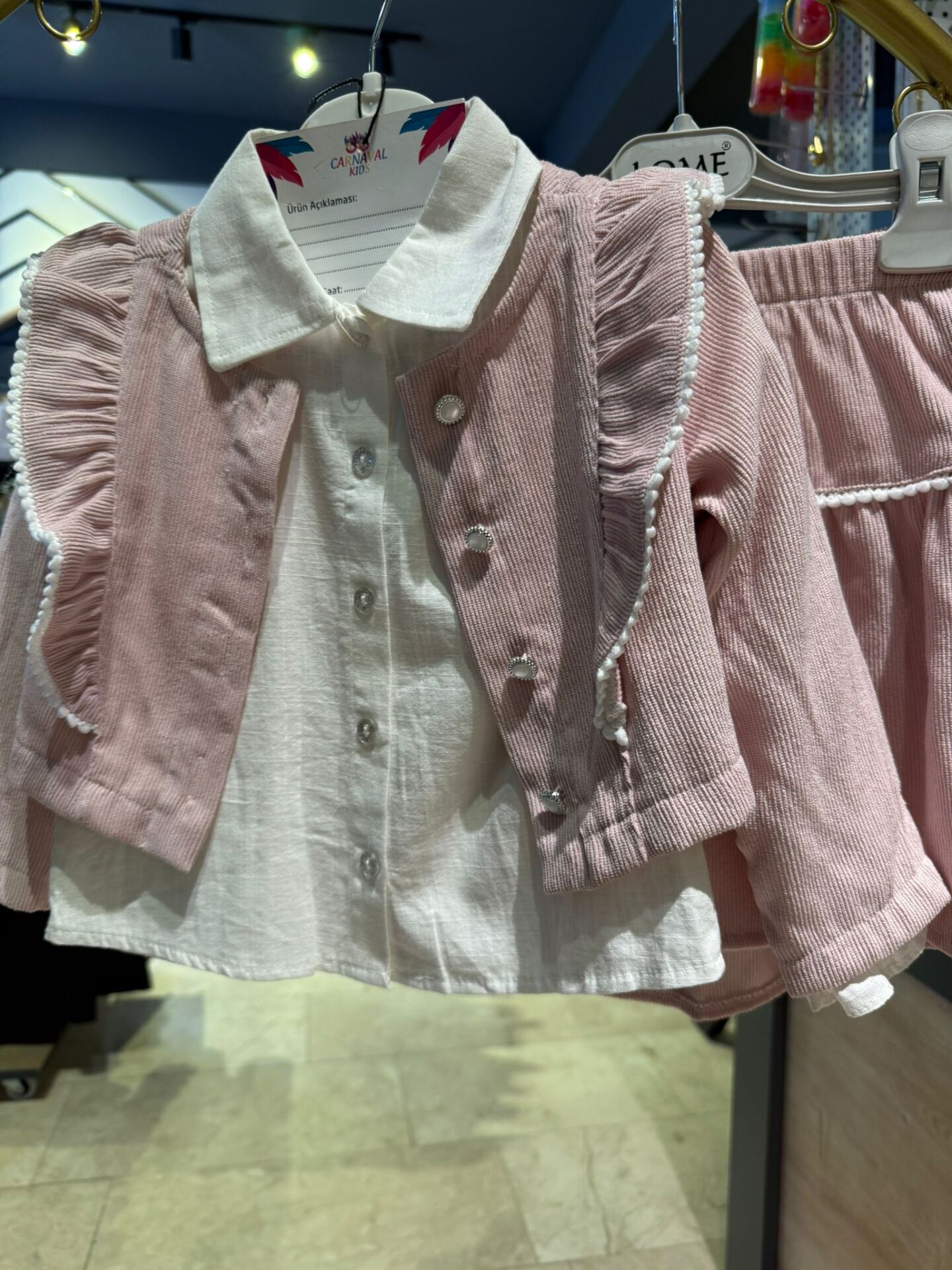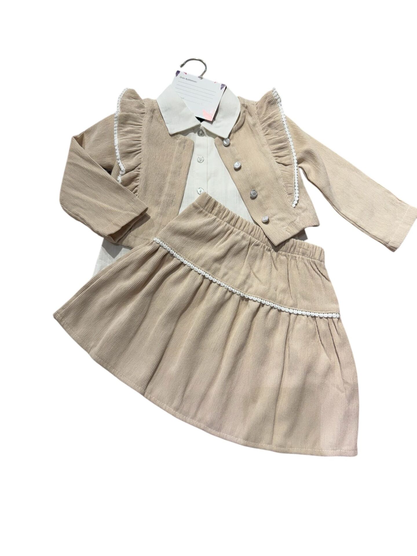Zarif detayları ve şık dokusuyla öne çıkan bu kız çocuk takımı, özel günlerden günlük kombinlere kadar geniş kullanım alanı sunar. Kadife dokulu yelek ve etek, gömlek yaka üst parça ile tamamlanarak klasik ve modern çizgiyi bir araya getirir.