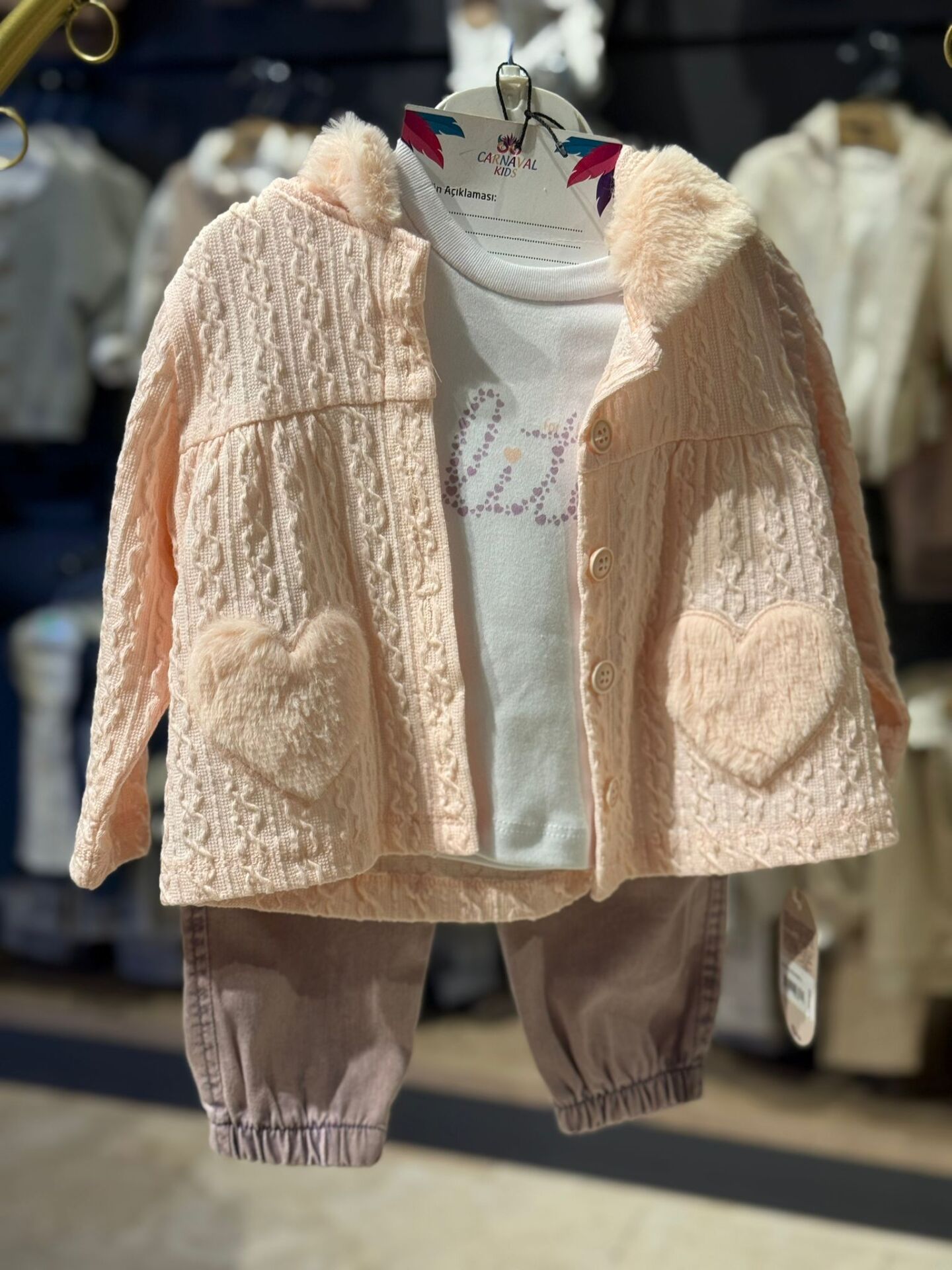 Soğuk havalar için tasarlanmış bu şık 3’lü takım, yumuşak dokusu ve modern görünümüyle çocukların konforunu ön planda tutar. Kürk detaylı kapüşonlu üstü, uyumlu iç tişörtü ve lastik paçalı pantolonu ile hem sıcak tutar hem de rahat bir kullanım sunar.