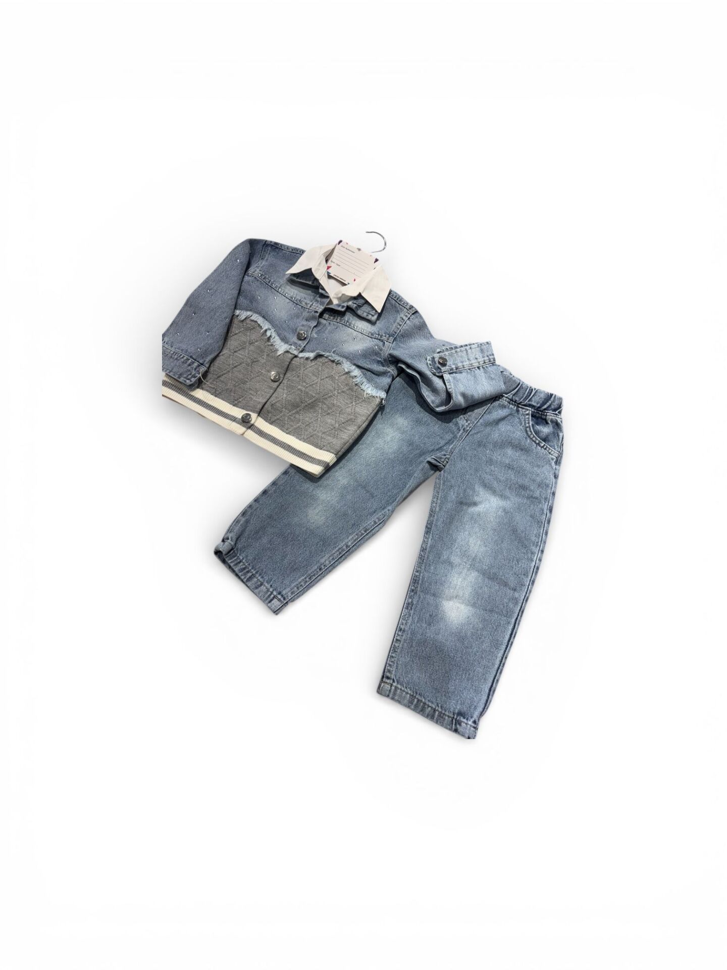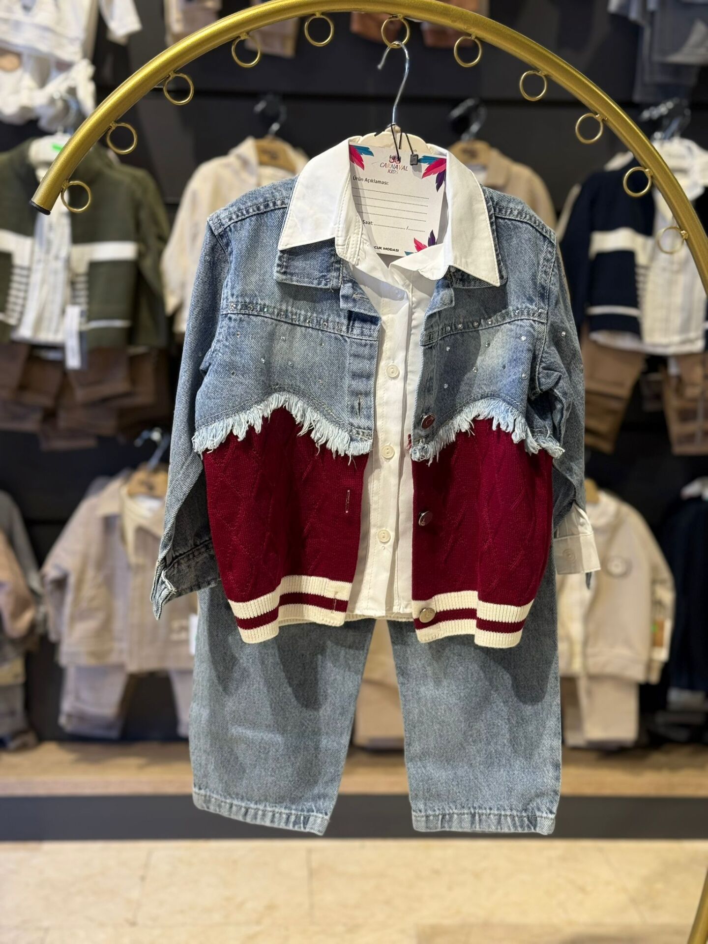 Modern ve şık detaylarıyla öne çıkan bu kız çocuk 3’lü takım, günlük kombinlerden özel gün şıklığına kadar geniş bir kullanım alanı sunar. Kot ceket, iç gömlek ve kot pantolondan oluşan set; rahat kalıbı ve zamansız tasarımıyla konforu ön planda tutar.