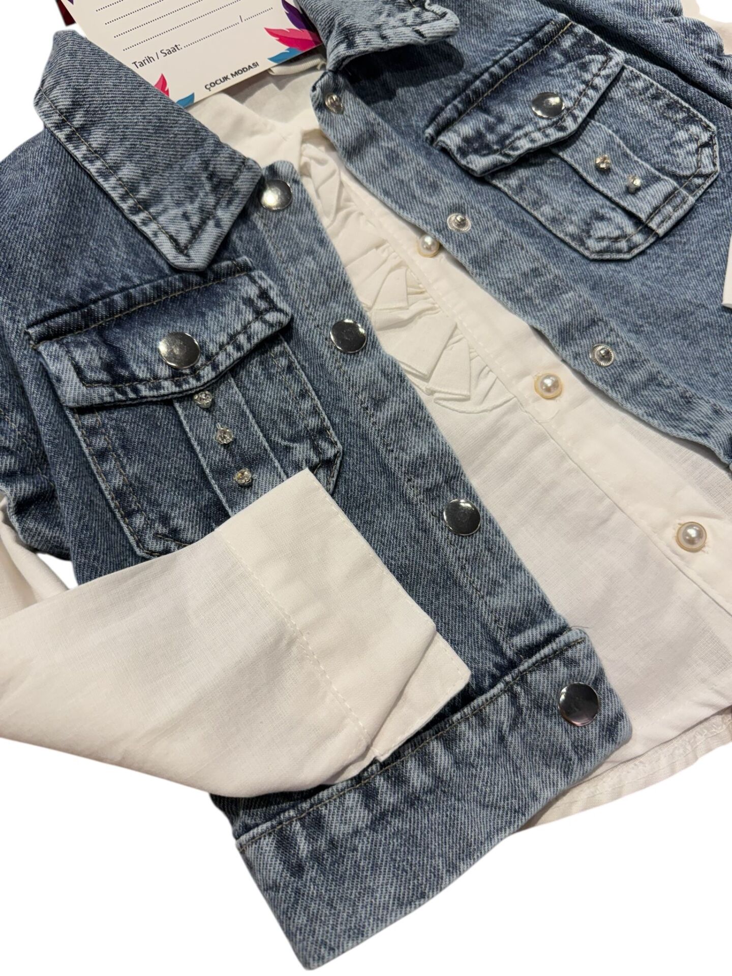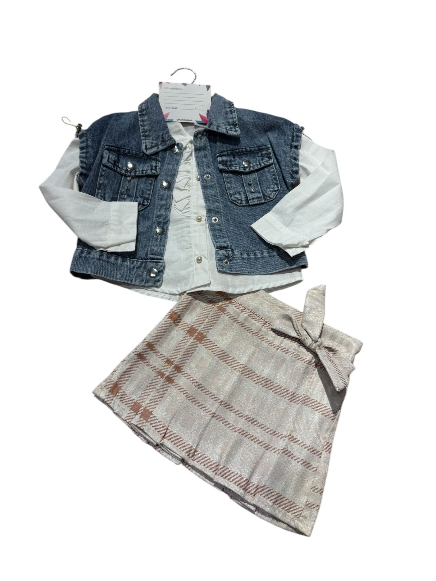 Şıklığı ve zarafeti bir arada sunan bu kız çocuk 3’lü takım, modern kombin sevenler için özel olarak tasarlanmıştır. Kot yelek, uzun kollu gömlek ve desenli etekten oluşan set; hem günlük kullanım hem de özel günler için ideal bir seçenektir.