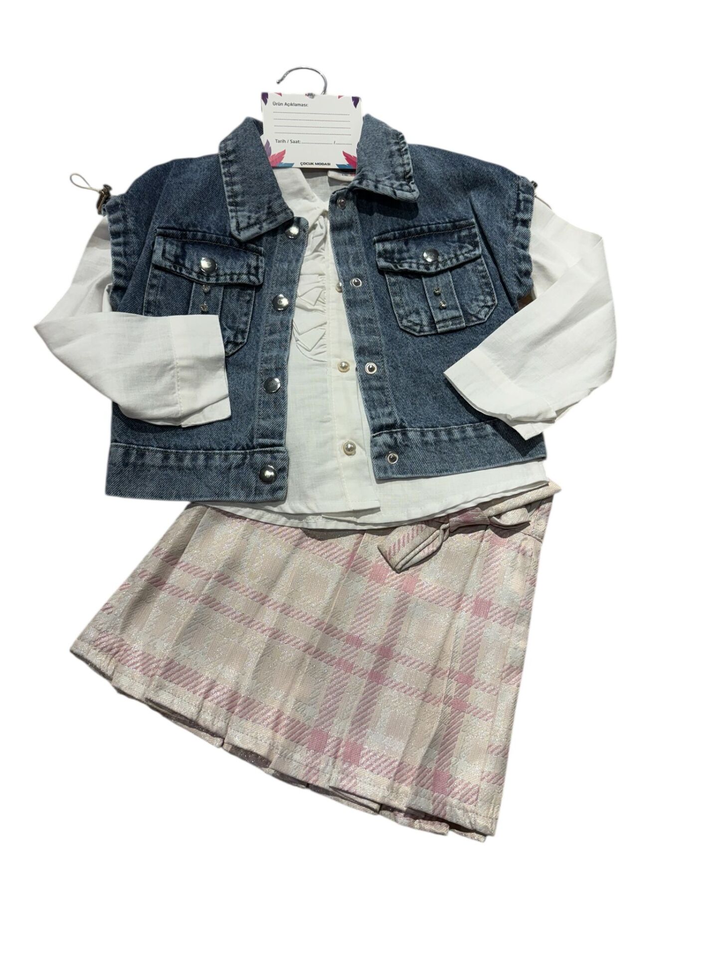 • 3 parçadan oluşur: Kot yelek + Gömlek + Etek