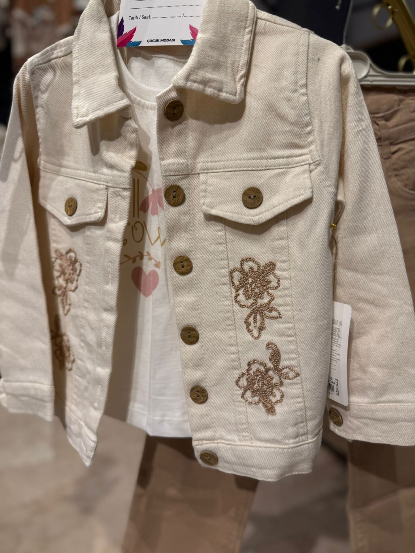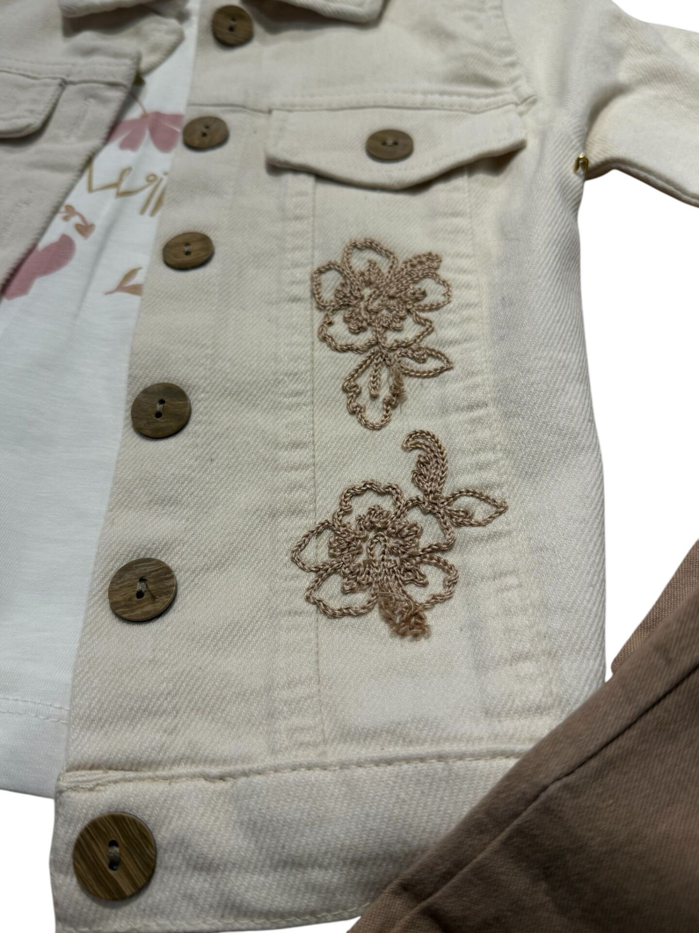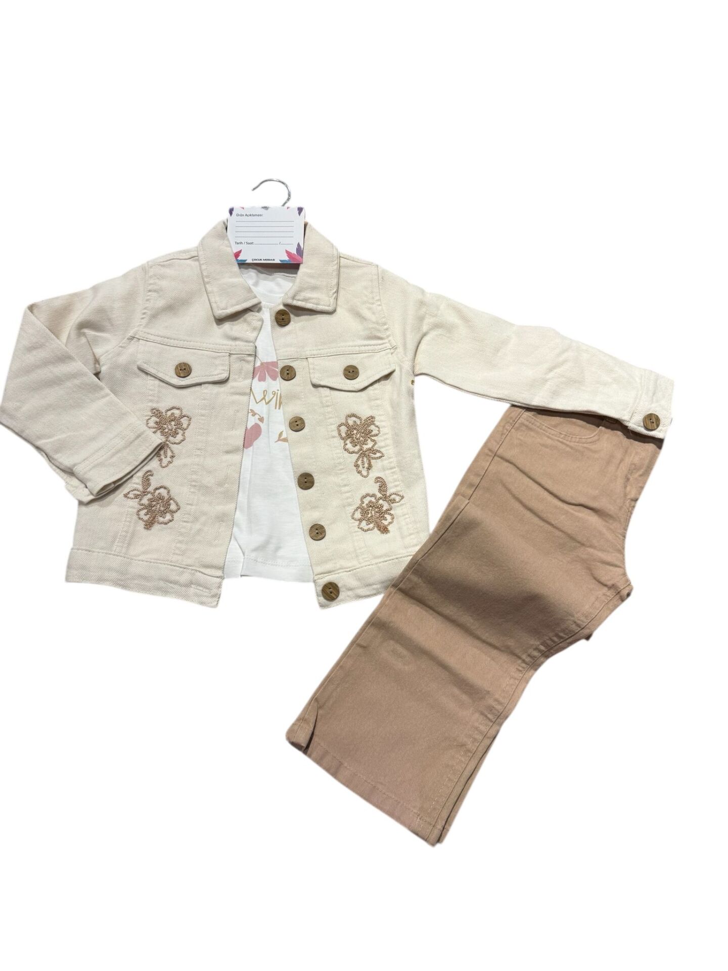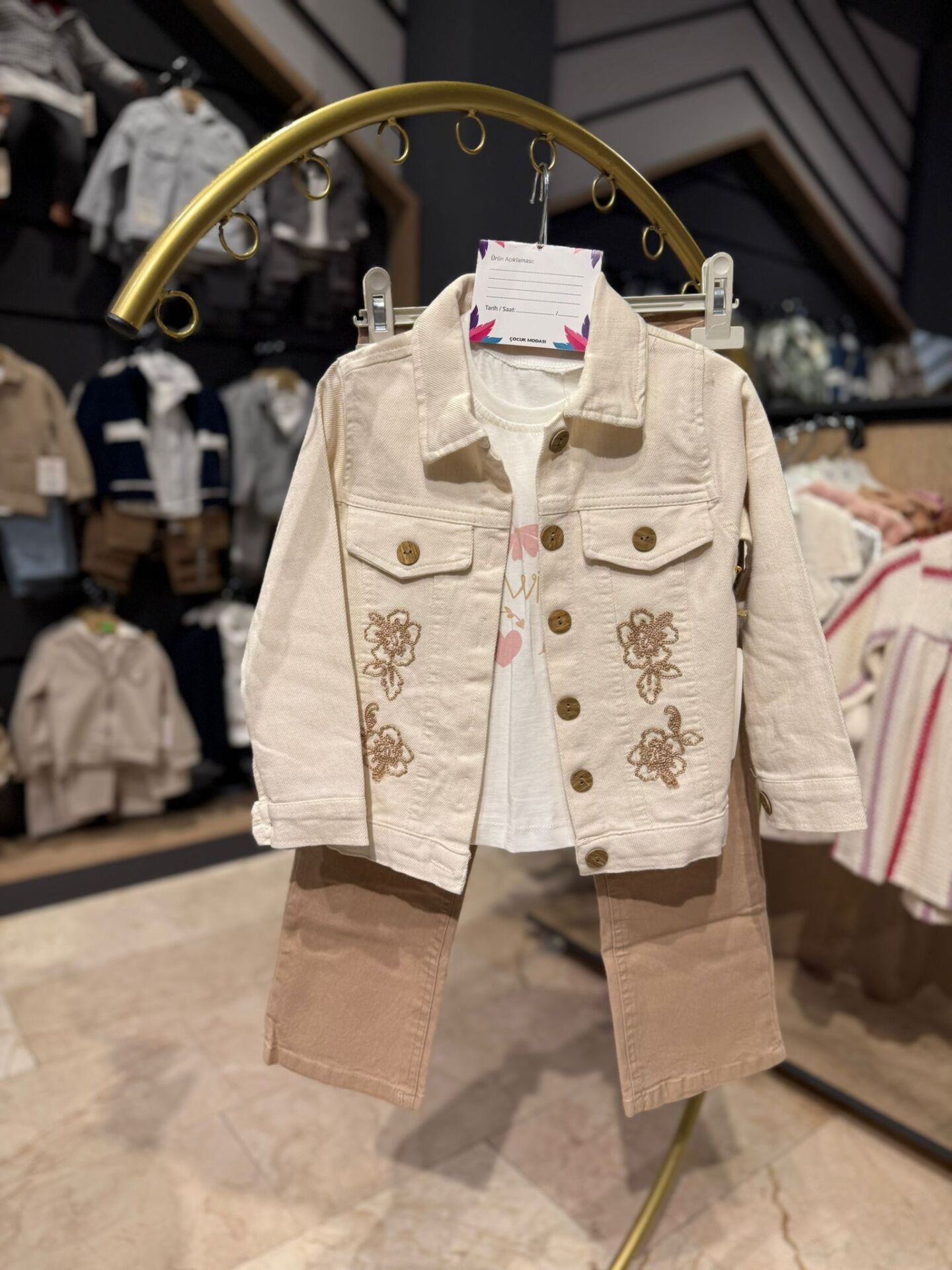 Doğal tonları ve zarif detaylarıyla öne çıkan bu kız çocuk 3’lü takım, şıklık ve konforu bir arada sunar. Nakış detaylı ceket, yumuşak dokulu tişört ve esnek yapılı pantolon ile hem günlük kullanım hem de özel kombinler için ideal bir seçenektir.