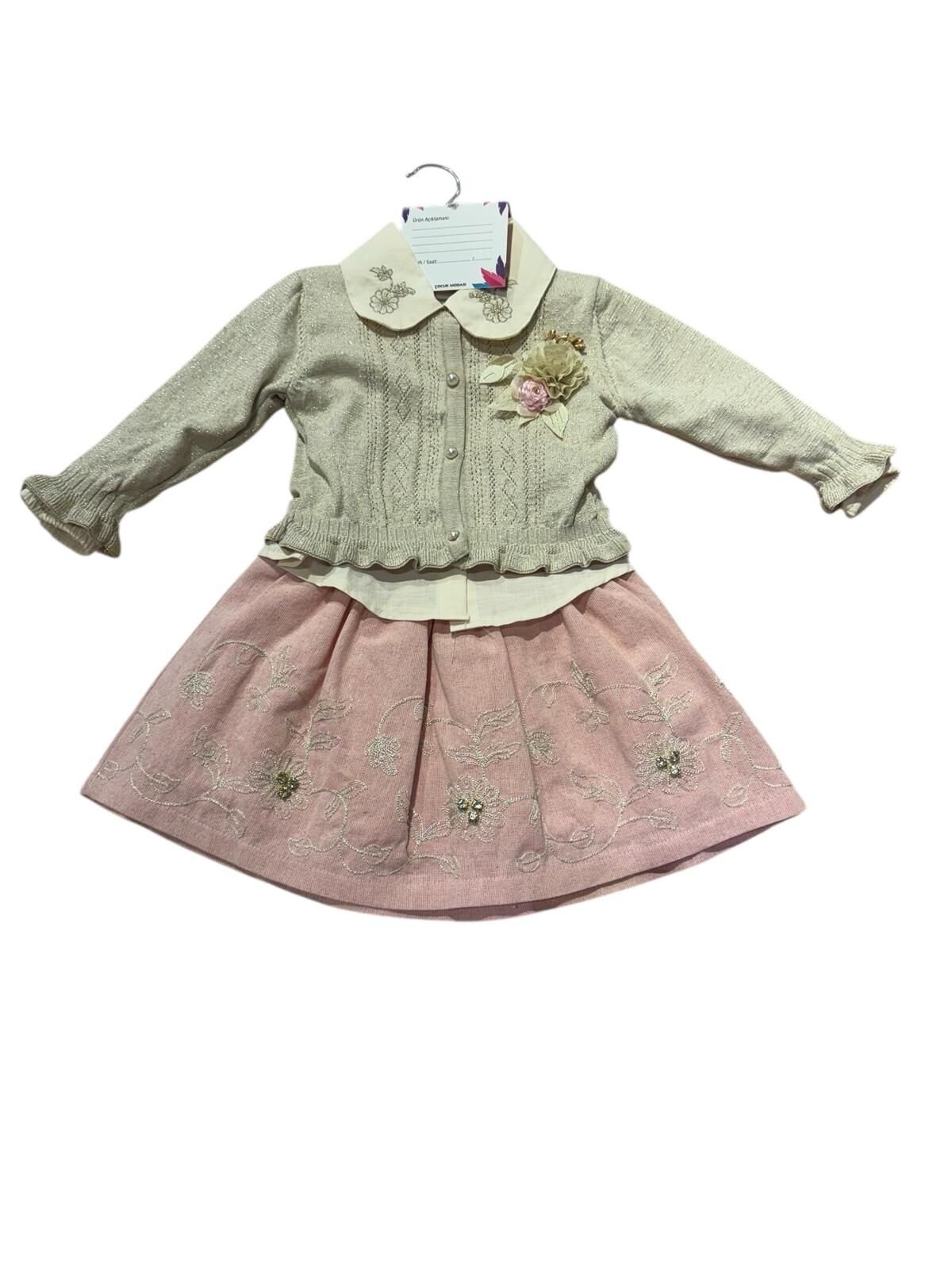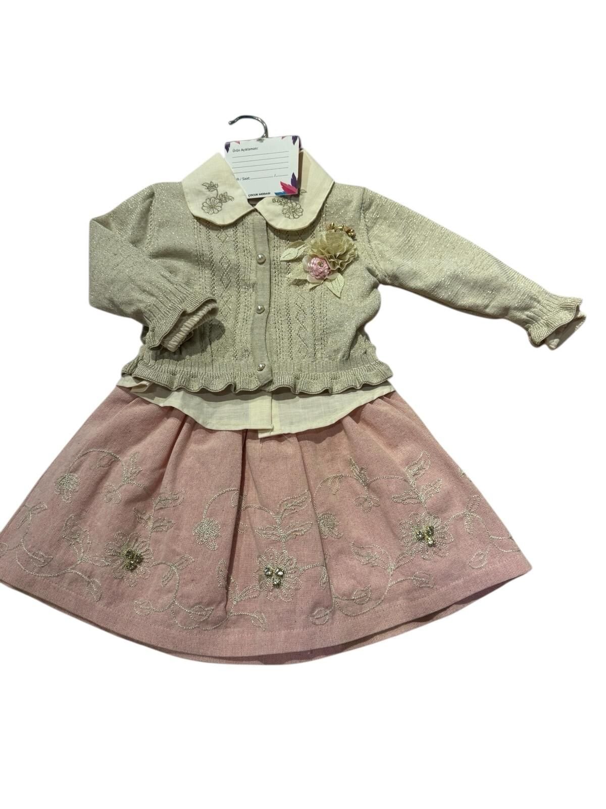 Zarif detayları ve uyumlu renkleriyle öne çıkan bu kız çocuk üçlü kombin, özel günler ve günlük şıklık için özenle tasarlanmıştır. İşlemeli etek, klasik yakalı gömlek ve tamamlayıcı hırkadan oluşan set; hem rahat hem de şık bir görünüm sunar.