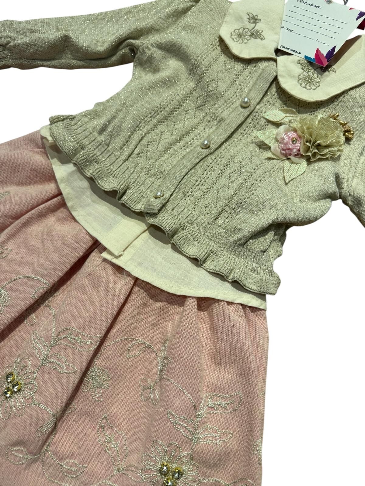 Kız Çocuk Şık Üçlü Kombin – İşlemeli Etek, Gömlek ve Hırka Takımı