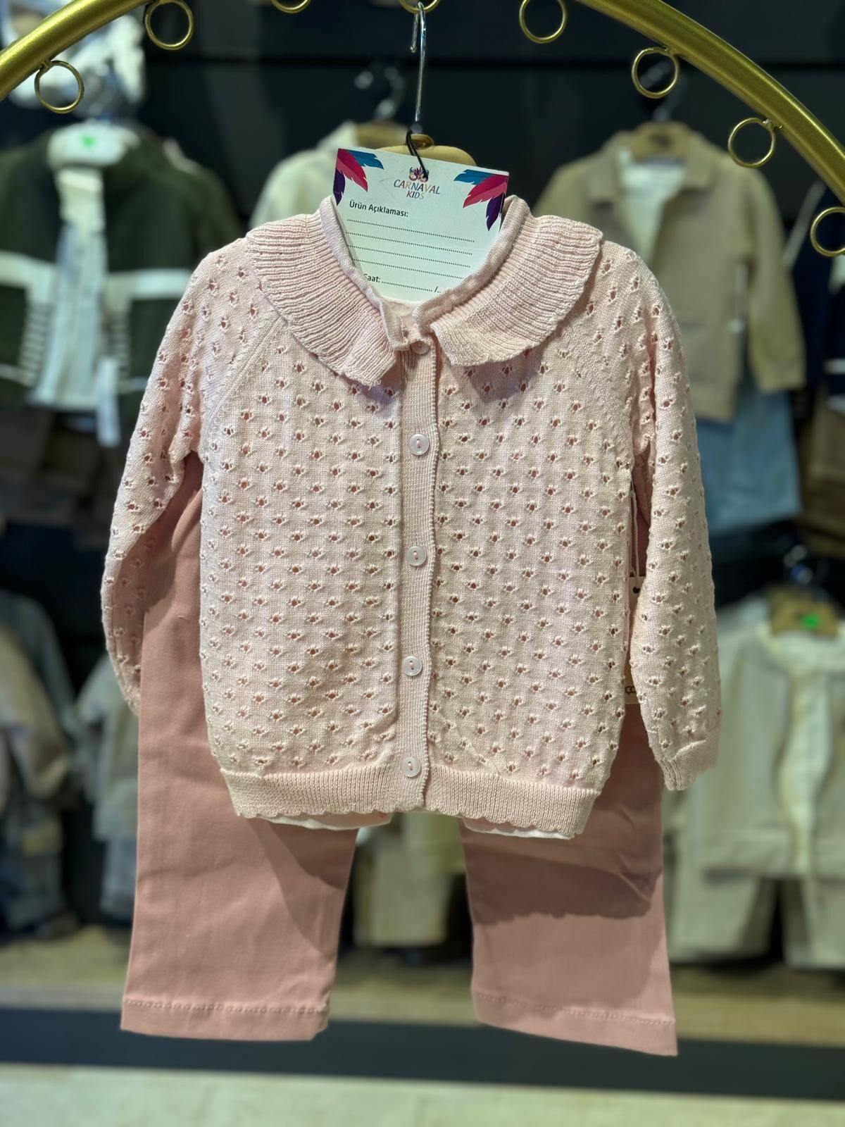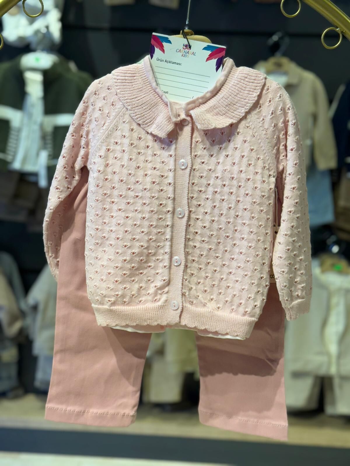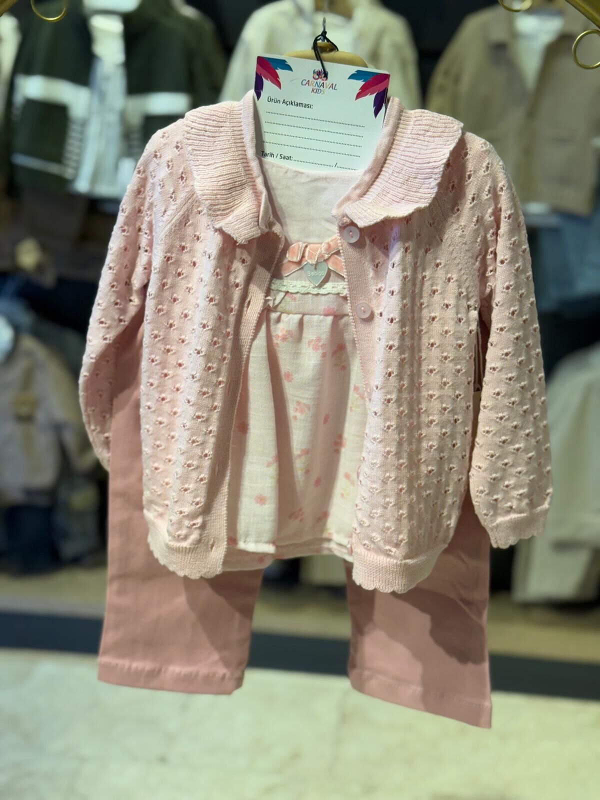 Zarif detayları ve yumuşak dokusuyla miniklerin şıklığını tamamlayan bu özel 3’lü takım, hem günlük kullanım hem de özel günler için ideal bir tercihtir. Delikli triko hırkası, desenli bluzu ve rahat kesim pantolonu ile şıklık ve konforu bir arada sunar.
