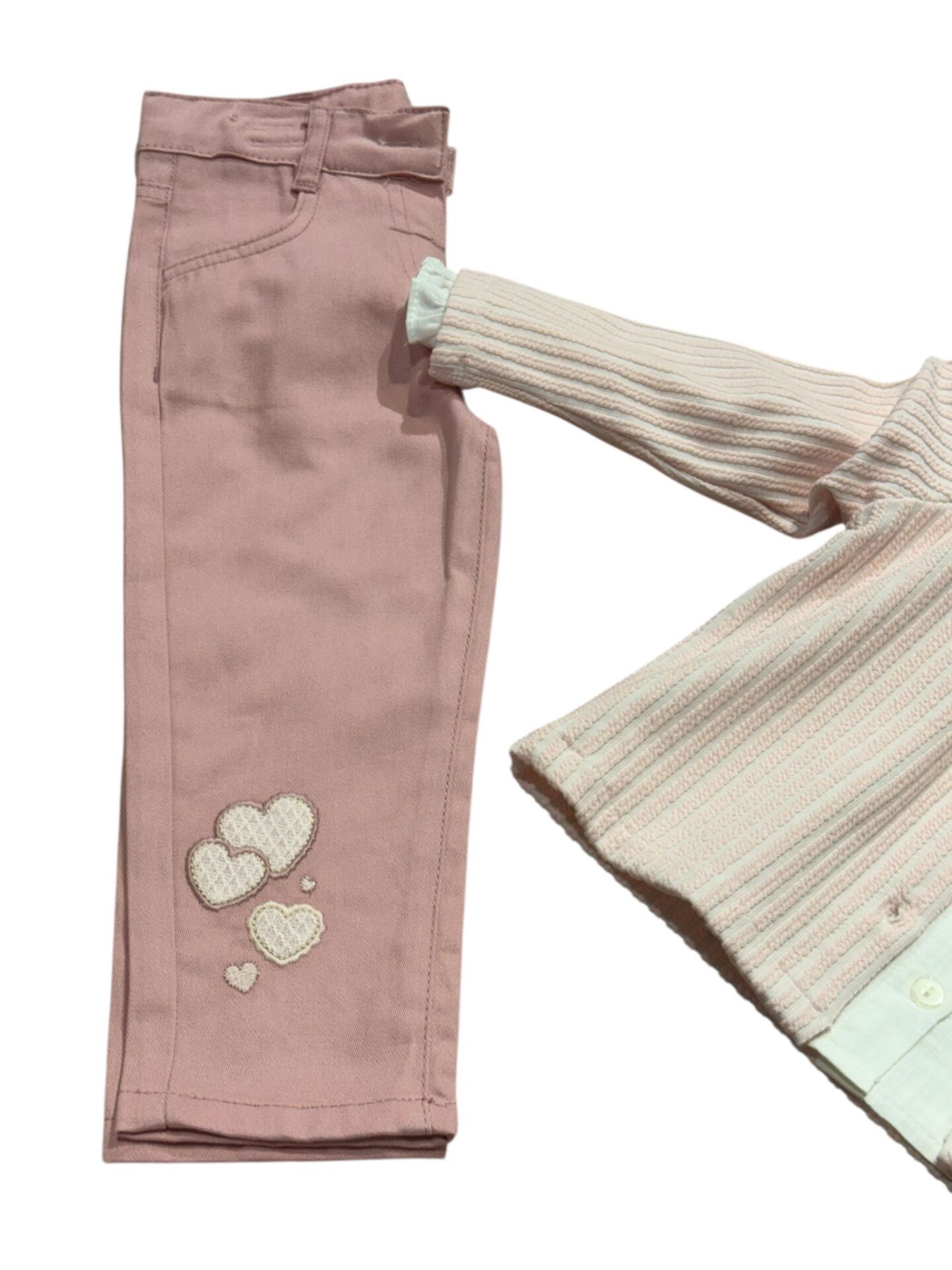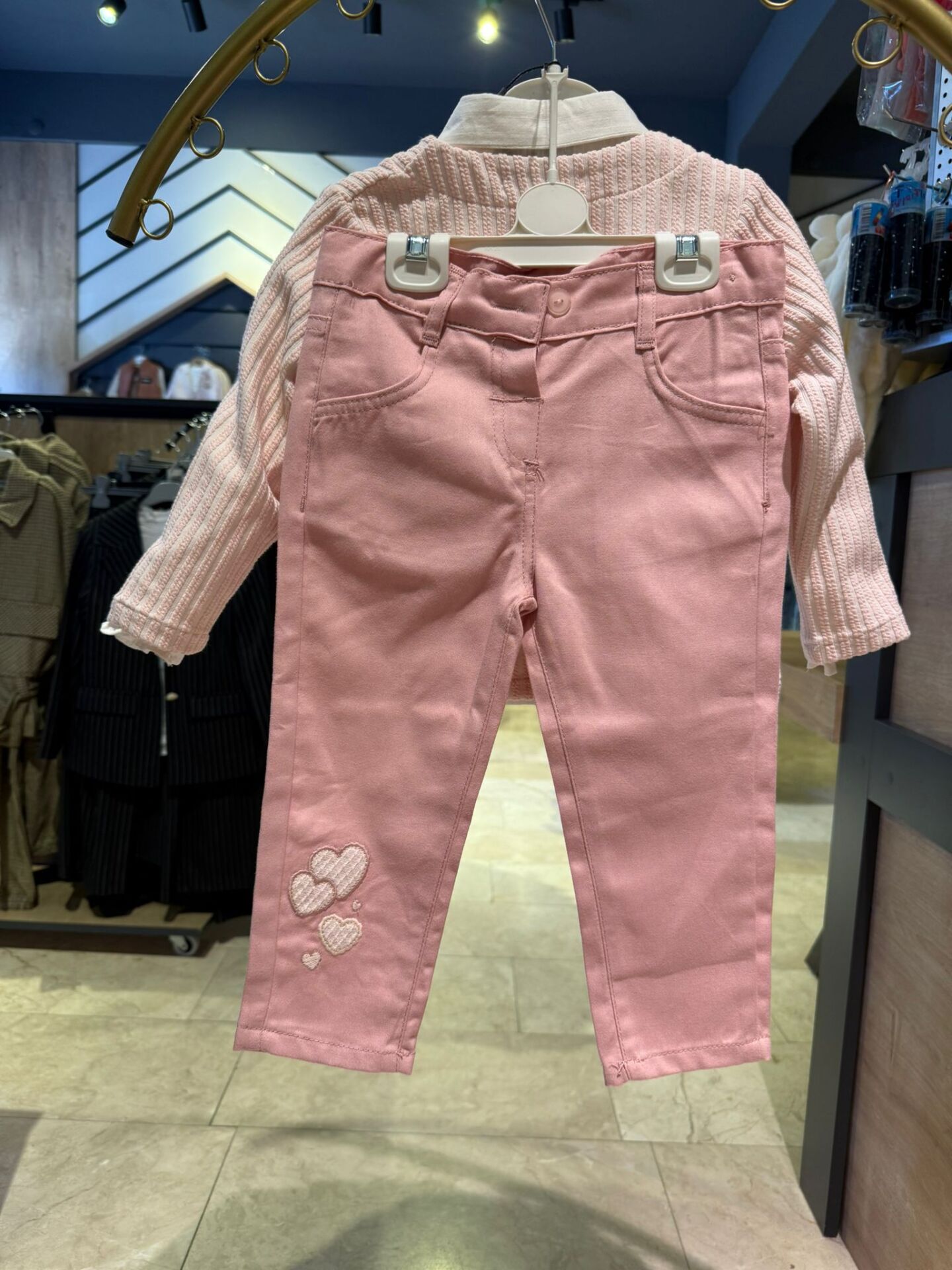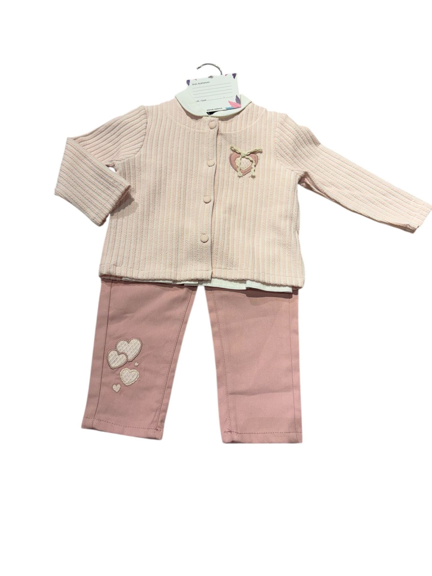 Hırka üzerindeki sevimli kalp detayı ve pantolondaki nakışlar takıma sıcak ve modern bir görünüm kazandırır. Rahat kalıbı sayesinde çocukların gün boyu konforlu hareket etmesine olanak tanır.