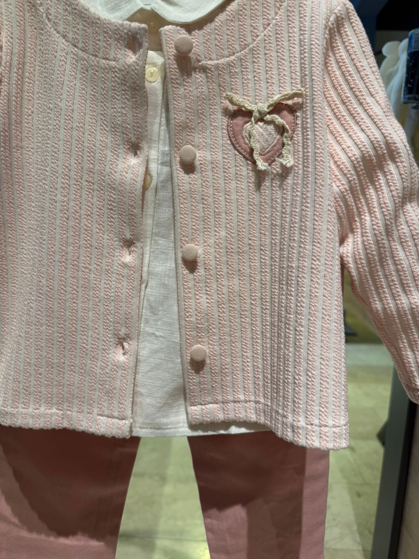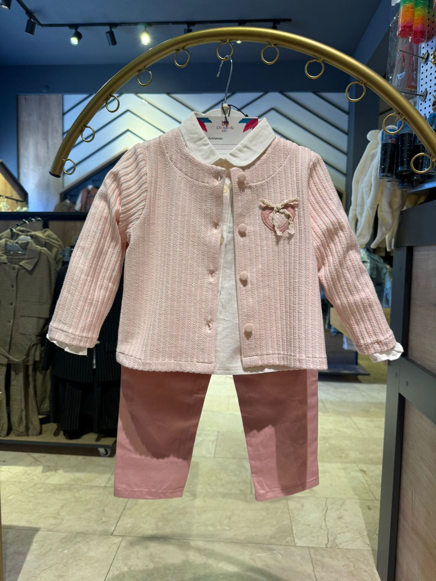Yumuşak dokusu ve zarif detaylarıyla öne çıkan bu kız çocuk 3’lü takım, hem şıklık hem de konfor arayanlar için ideal bir settir. Triko dokulu düğmeli hırka, iç tişört ve kalp nakışlı pantolondan oluşan takım; günlük kullanımda ve özel gün kombinlerinde rahatlıkla tercih edilebilir.