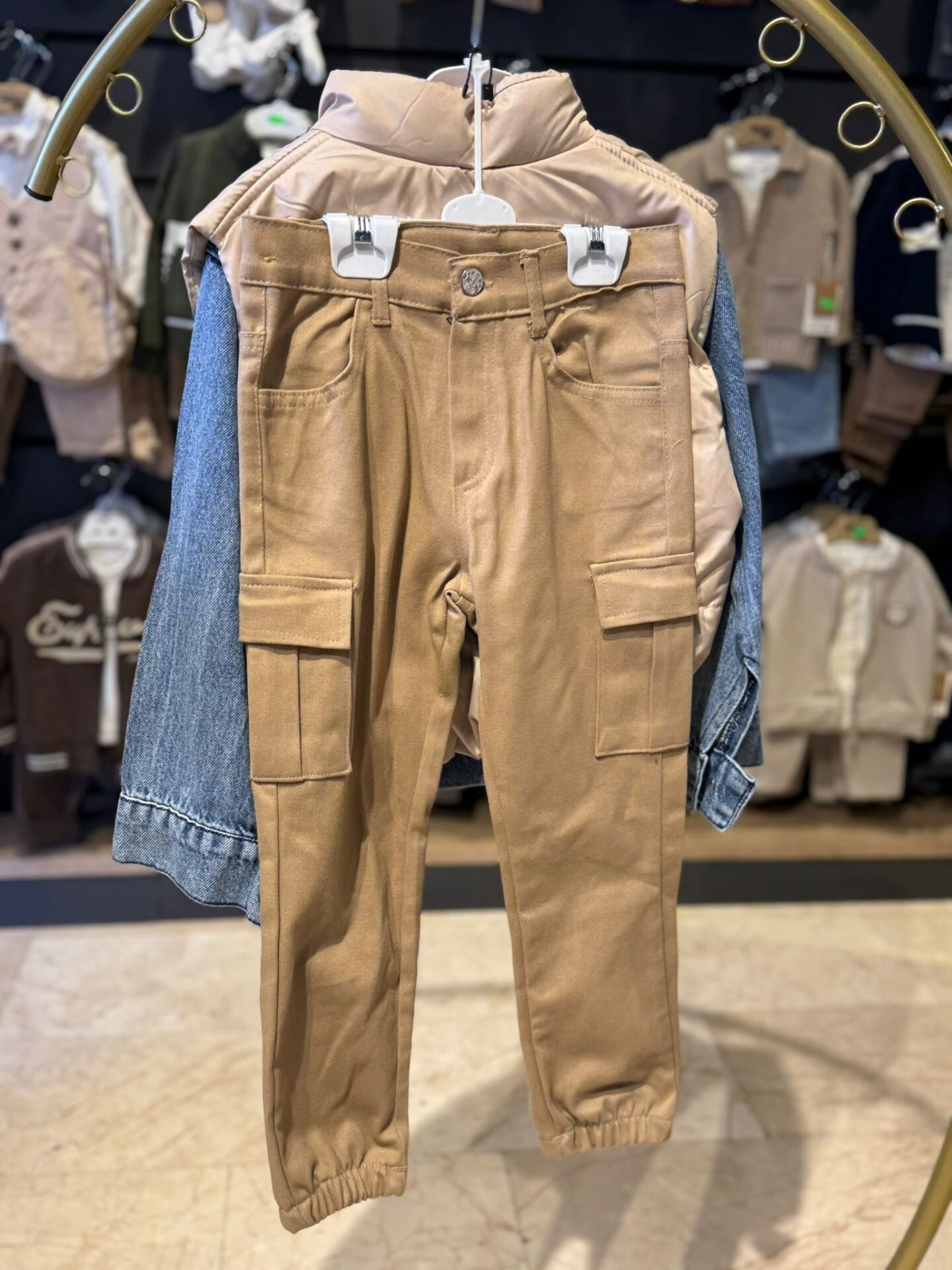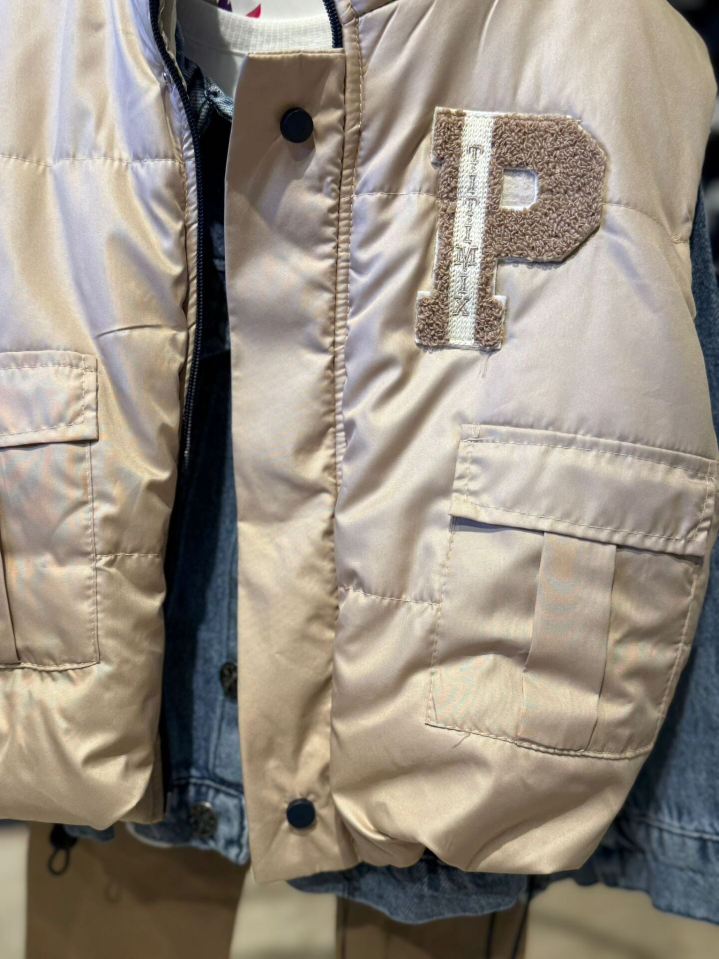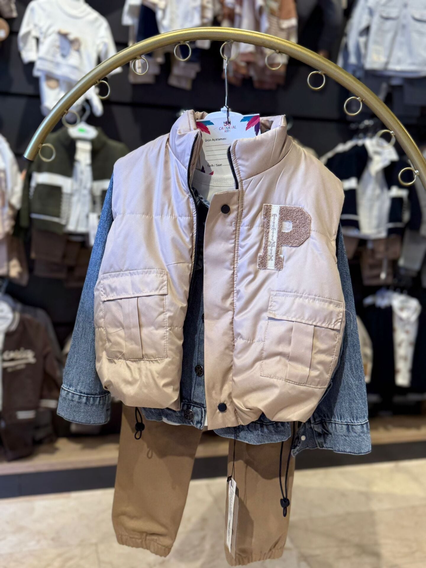 Bu modern ve kullanışlı çocuk takımı; şişme yelek, kot ceket, uzun kollu badi ve rahat kesim pantolondan oluşur. Hafif yapılı şişme yelek, serin havalarda ekstra koruma sağlarken cep detayları ve harf aplikesiyle sportif bir görünüm sunar. Altında yer alan kot ceket, dayanıklı kumaşı ve klasik tasarımıyla kombinlere şıklık katar. İçte bulunan yumuşak dokulu badi, gün boyu konforlu bir kullanım sağlar. Esnek paçalı pantolon ise rahat kesimiyle çocukların özgürce hareket etmesine olanak tanır. Günlük kullanım ve mevsim geçişleri için ideal olan bu takım, hem şık hem de rahat bir alternatiftir.