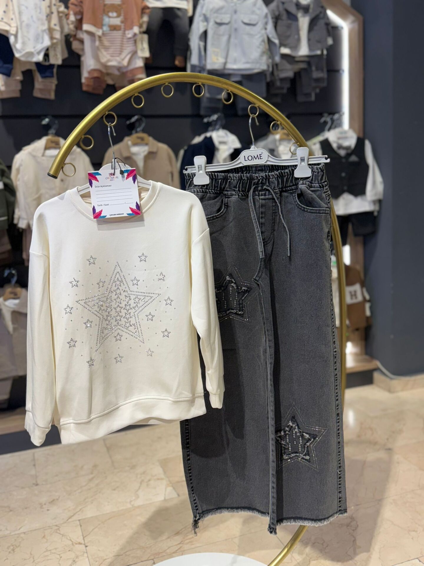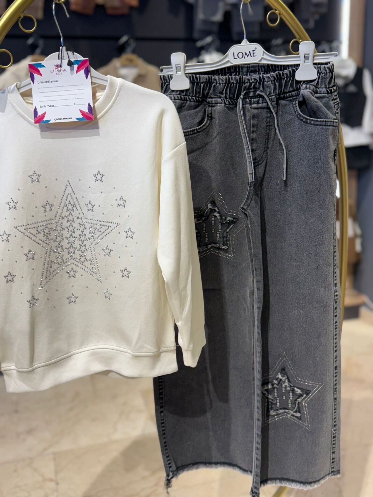 Günlük şıklığı rahatlıkla birleştiren bu ikili kız çocuk takımı, modern tasarımı ve dikkat çeken yıldız taş detaylarıyla öne çıkar. Hem konforlu hem de stil sahibi kombin arayanlar için ideal bir tercihtir.